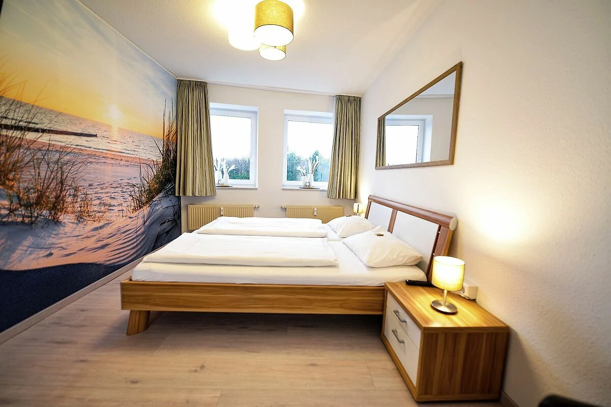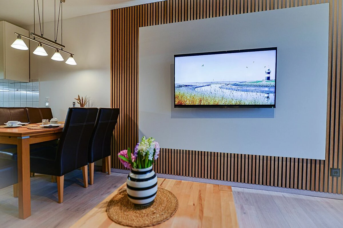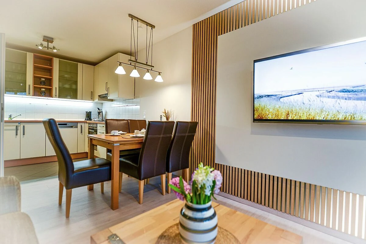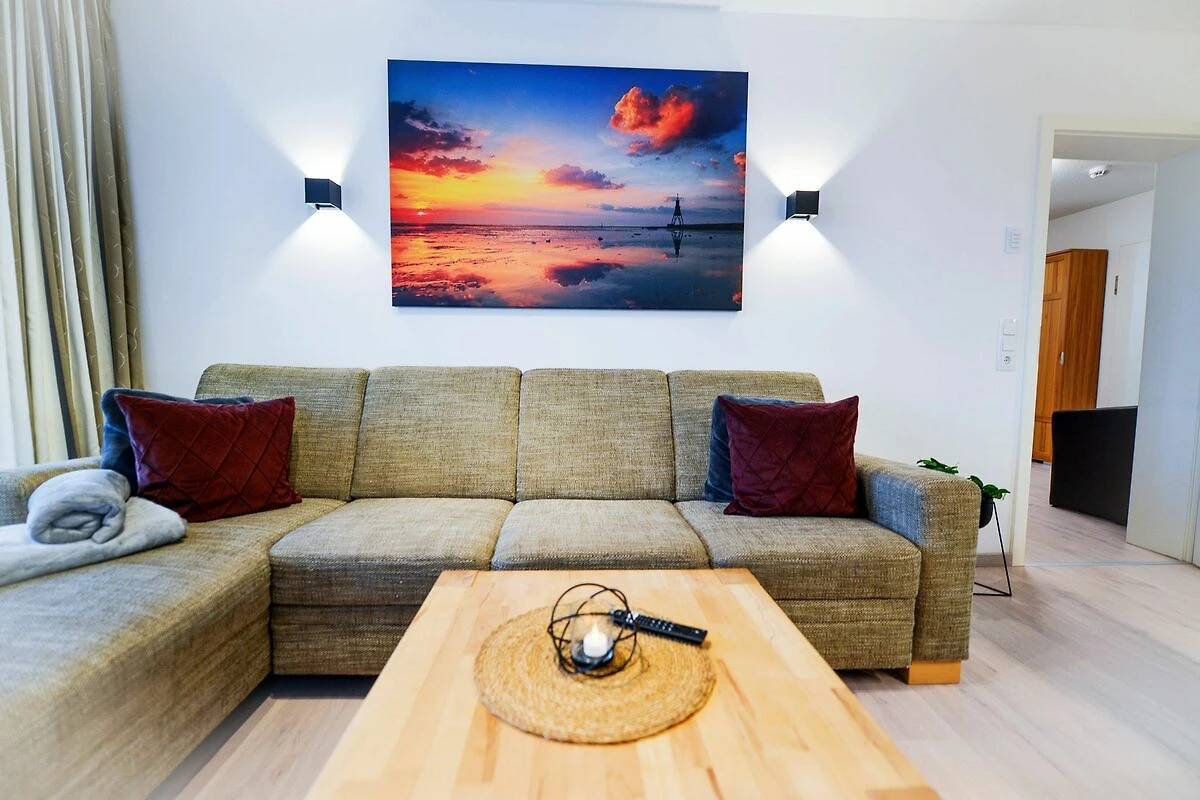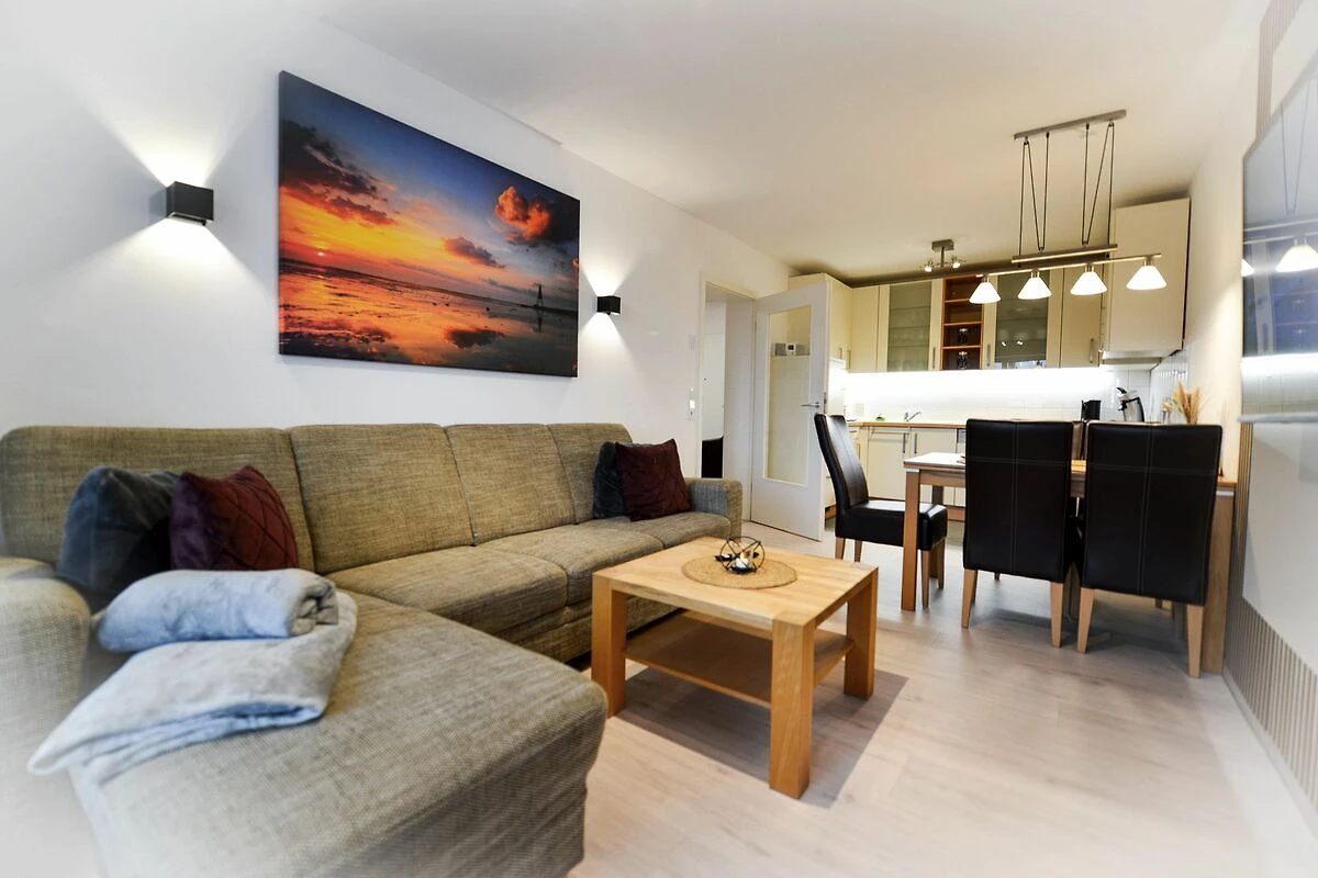 Mit einer Fläche von 63m² bietet diese Ferienwohnung ein ideales Zuhause für Ihren Nordseeurlaub. Die liebevoll neu gestaltete Einrichtung lässt keine Wünsche offen und sorgt für Gemütlichkeit und Entspannung. Die vollwertige Ausstattung umfasst eine hochwertige Küchenzeile, die sich perfekt für die Zubereitung besonderer Mahlzeiten eignet. Der Wohnbereich lädt zu gemütlichen TV-Abenden ein, während das Bad mit Badewanne Erholung und lange Bäder für die nötige Energie bietet. Im Schlafzimmer mit dem Doppelbett gibt es jetzt auch einen Fernseher, um gemütliche Stunden vor dem Schlafengehen zu genießen. Der Strand ist nur einen kurzen Spaziergang entfernt und schnell zu erreichen. Für erholsame Stunden nach einem Tag am Meer bietet der überdachte Balkon mit seitlicher Seesicht den idealen Rückzugsort.