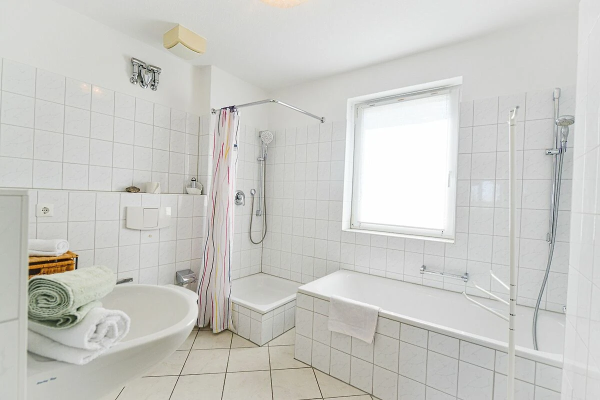 Das Tageslichtbad mit Dusche, Badewanne und WC sorgt für zusätzlichen Komfort. Ein eigener kostenloser PKW-Stellplatz steht direkt am Haus zur Verfügung. Für frische Brötchen am Morgen sorgt ein saisonal geöffneter Bäcker im Gebäude.