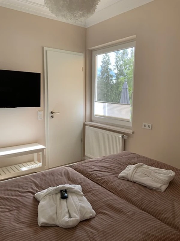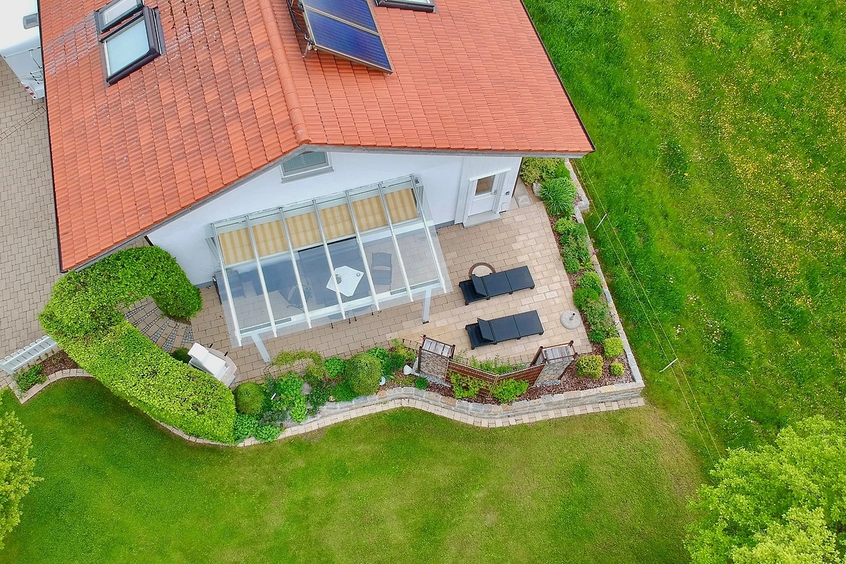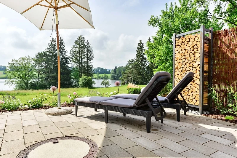 Im EG ist eine ca. 35 m2 grosse Terrasse dort steht für Sie ein gemauerter Grill, Gartentisch, Gartenstühle, Liegen, Sonnenschirm, eine 6 x 3 m grosse Überdachung mit Glasdach und Markise. Die Eingasgstüre zur Wohnung ist direkt an der Terrasse. Betritt man die Wohnung ist im EG links das Schlafzimmer mit Einbauschrank und einem 1,8 x 2,0 m grossen Doppelbett. Im 1ten Stock befindet sich ein grosser Wohn-Essbereich mit einer voll ausgestatteten Einbauküche. Das Badezimmer, ausgestattet mit einer 1 x 1 m grossen Dusche, WC und einem grossen Waschtisch, befindet sich ebenfalls im 1ten Stock. Im Anschluss zum Esstisch befindet sich ein 1,4 x 2,0 m grosses Bett dass zum Chillen oder als 2ten Schlafplatz genutzt werden kann. Im EG sowie im 1ten Stock befindet sich jeweils 1 Fernseher.