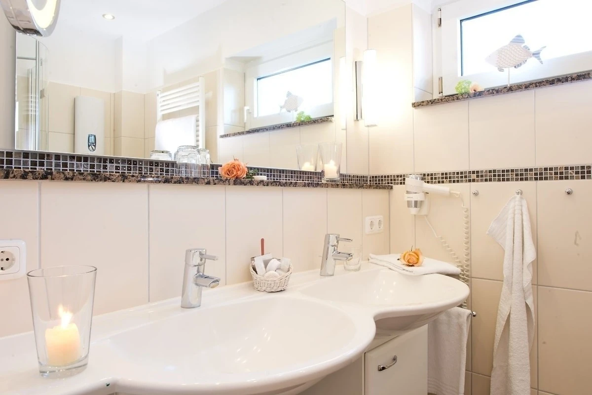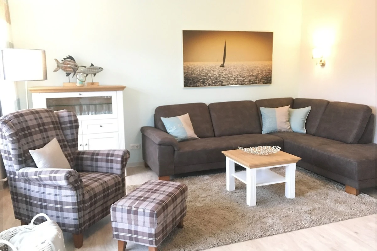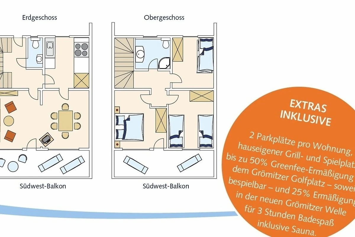 Die in allen Wohneinheiten identische Ausstattung im Einzelnen: Heller Eingangsflur, geräumiges Wohnzimmer mit gemütlicher Eckcouch und grossem Esstisch, Flachbild-TV, Stereoanlage, Telefon, separate moderne Küche, u. a. mit Mikrowelle, Geschirrspüler und Backofen, 3 Schlafzimmer (5 exklusive Boxspringbetten für erholsamen Schlaf), Safe, Badezimmer mit Doppelwaschtisch und Dusche, separates Gäste-WC im EG, Südbalkone auf beiden Wohnebenen. Münzwaschmaschine und -trockner, ein Fahrradkeller und der hauseigene Grill- und Spielplatz runden das Angebot ab.
