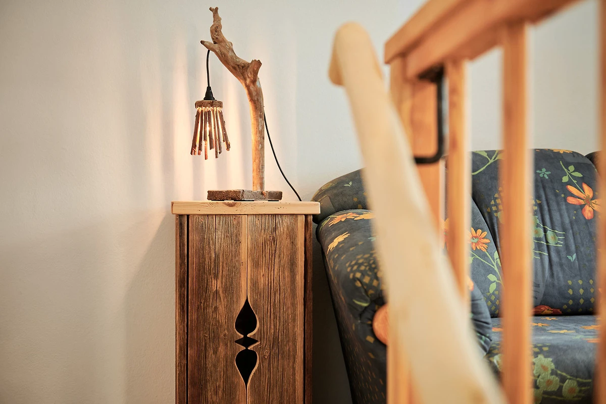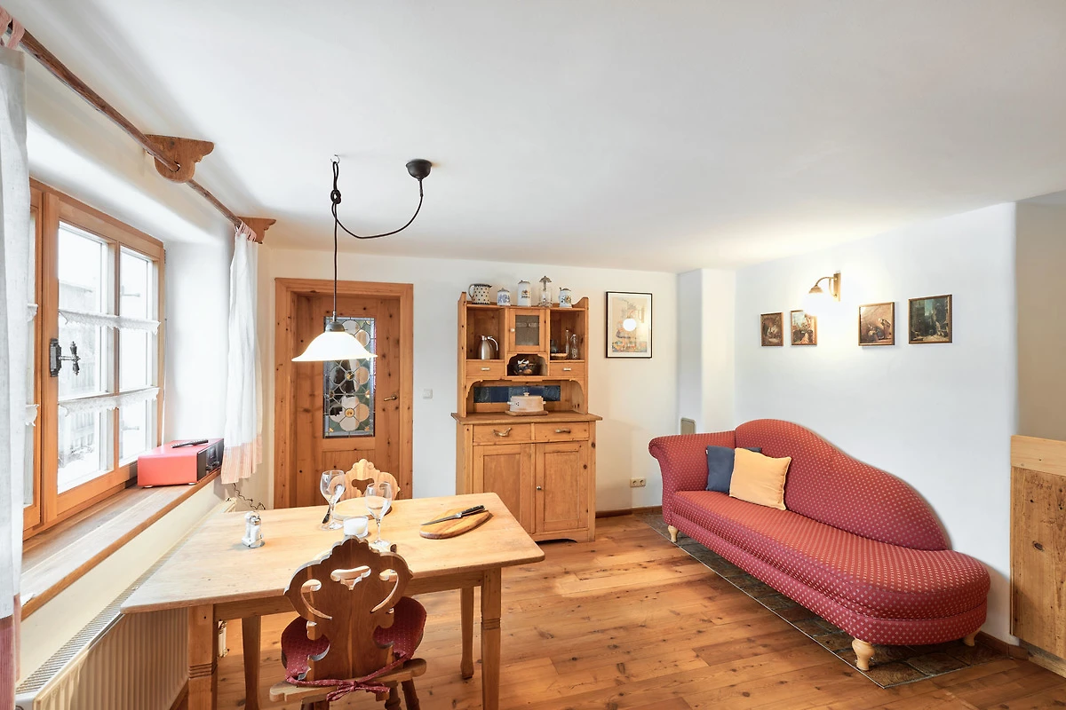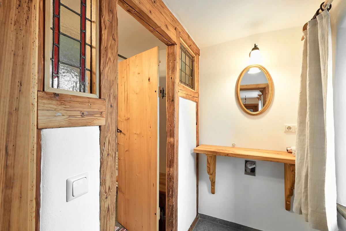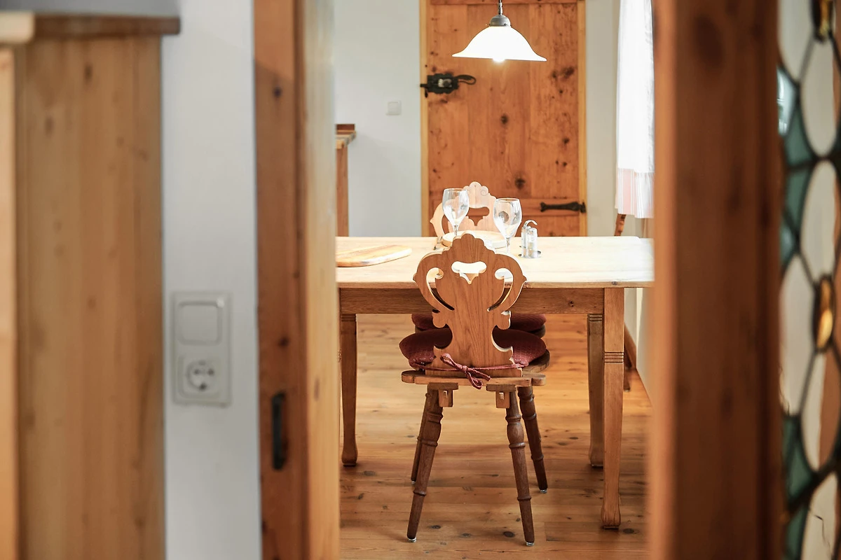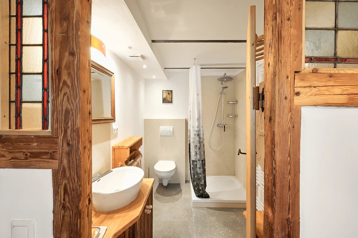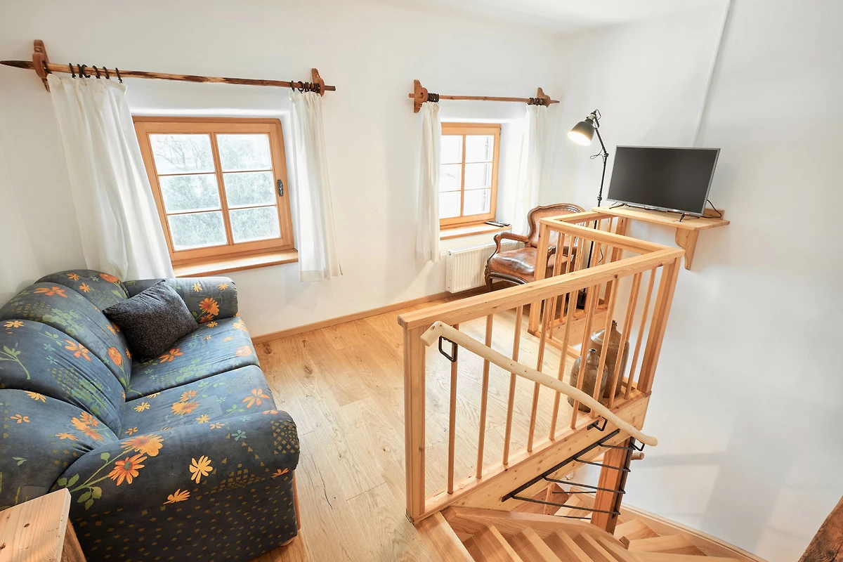 Die Wohnung "Beim Sattler" verfügt im Erdgeschoss über einen Wohn-/Essraum mit komplett eingerichteter Küchenzeile. Das Bad ist mit Dusche/WC, Waschtisch und Fön ausgestattet. Über die Diele mit Garderobe und Schuhbank erreicht man den 1. Stock. Dort befindet sich das Schlafzimmer mit grossem Doppelbett ( 2x2 Meter/hochwertige Matratzen), Kleiderschrank und grosser Kommode. Bei Bedarf kann ein Kindergitterbett für ein Kleinkind gemietet werden. Zwischen Schlafzimmer und Treppe wurde eine offene Loggia mit Fernseher und Leseraum eingerichtet. Dort steht eine Schlafcouch (1,25 x 2 m) für eine weitere Person zur Verfügung. Die gesamte Ferienwohnung ist mit geölten Holzböden ausgestattet (Ausnahme im Bad), liebevolle Details sorgen für eine "heimelige" Atmosphäre. Direkt vor dem eigenen Eingang liegt die Ostterrasse mit Sitzgelegenheit und Grill, ein kleiner Garten sowie der KFZ- Stellplatz. Für Fahrräder oder Ski ist ein abschliessbarer Abstellraum vorhanden. Achtung - für kleine Kinder besteht eine erhöhte Aufsichtspflicht, da sich direkt nebenan unser Teich befindet.