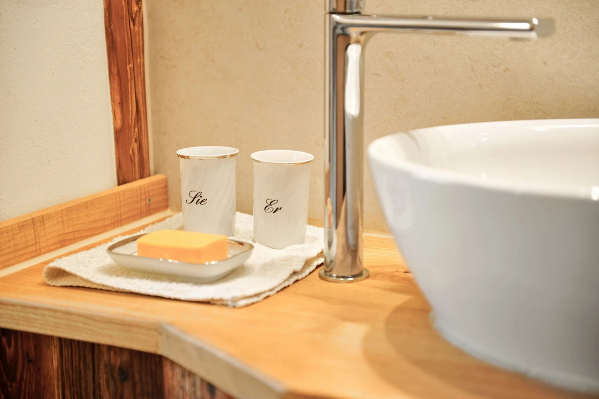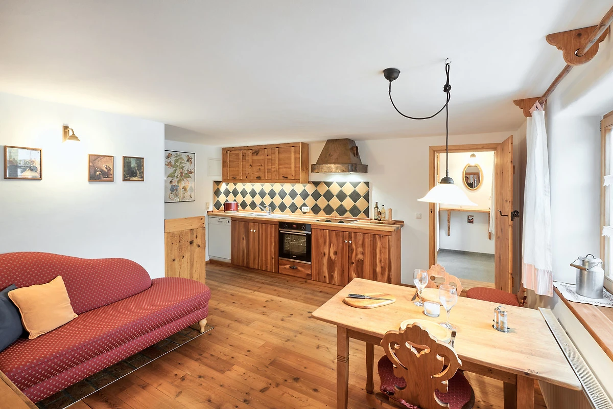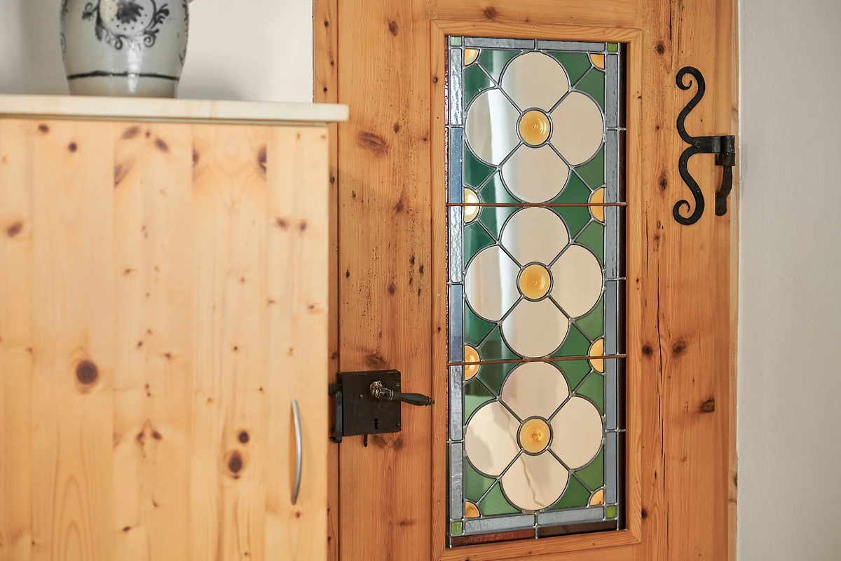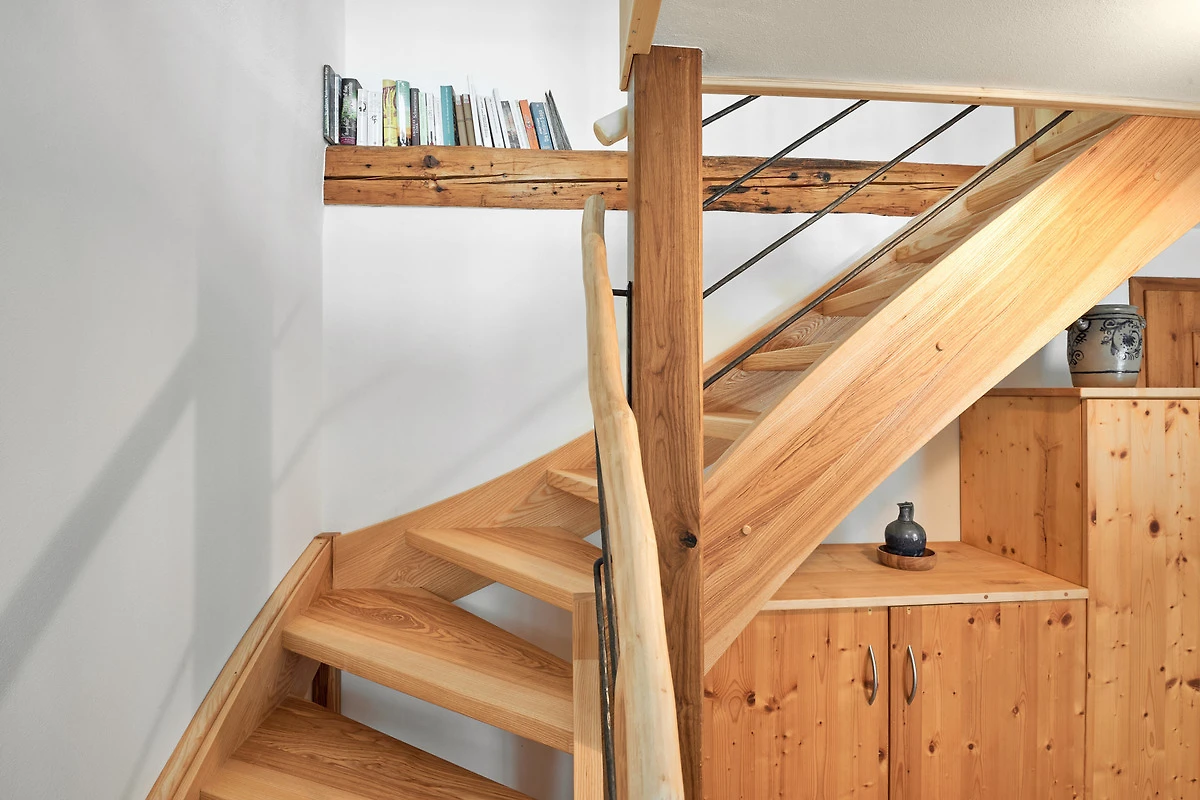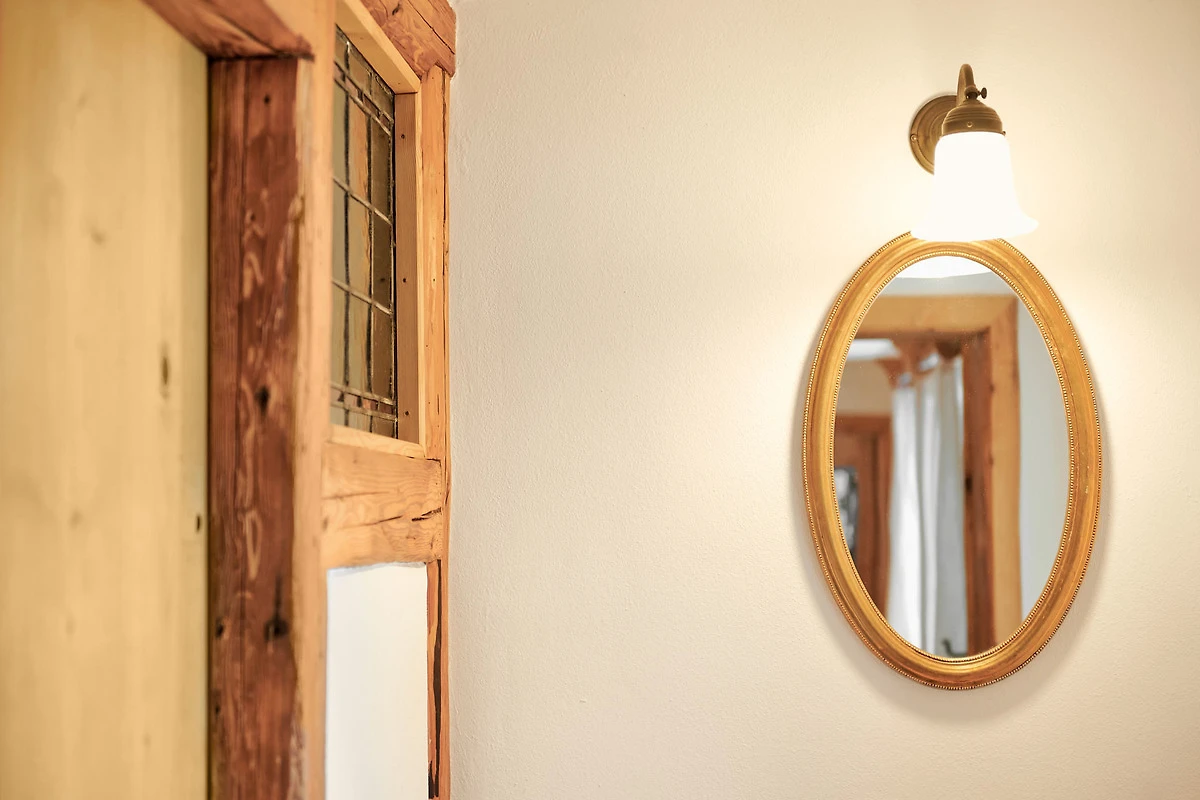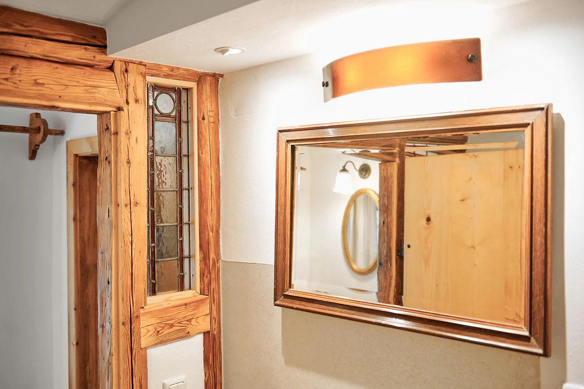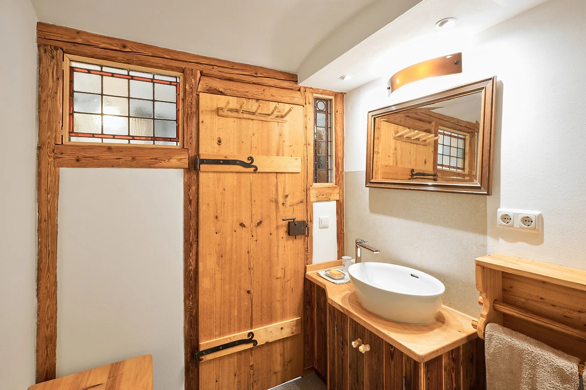 Die Wohnung "Beim Sattler" verfügt im Erdgeschoss über einen Wohn-/Essraum mit komplett eingerichteter Küchenzeile. Das Bad ist mit Dusche/WC, Waschtisch und Fön ausgestattet. Über die Diele mit Garderobe und Schuhbank erreicht man den 1. Stock. Dort befindet sich das Schlafzimmer mit grossem Doppelbett ( 2x2 Meter/hochwertige Matratzen), Kleiderschrank und grosser Kommode. Bei Bedarf kann ein Kindergitterbett für ein Kleinkind gemietet werden. Zwischen Schlafzimmer und Treppe wurde eine offene Loggia mit Fernseher und Leseraum eingerichtet. Dort steht eine Schlafcouch (1,25 x 2 m) für eine weitere Person zur Verfügung. Die gesamte Ferienwohnung ist mit geölten Holzböden ausgestattet (Ausnahme im Bad), liebevolle Details sorgen für eine "heimelige" Atmosphäre. Direkt vor dem eigenen Eingang liegt die Ostterrasse mit Sitzgelegenheit und Grill, ein kleiner Garten sowie der KFZ- Stellplatz. Für Fahrräder oder Ski ist ein abschliessbarer Abstellraum vorhanden. Achtung - für kleine Kinder besteht eine erhöhte Aufsichtspflicht, da sich direkt nebenan unser Teich befindet.
