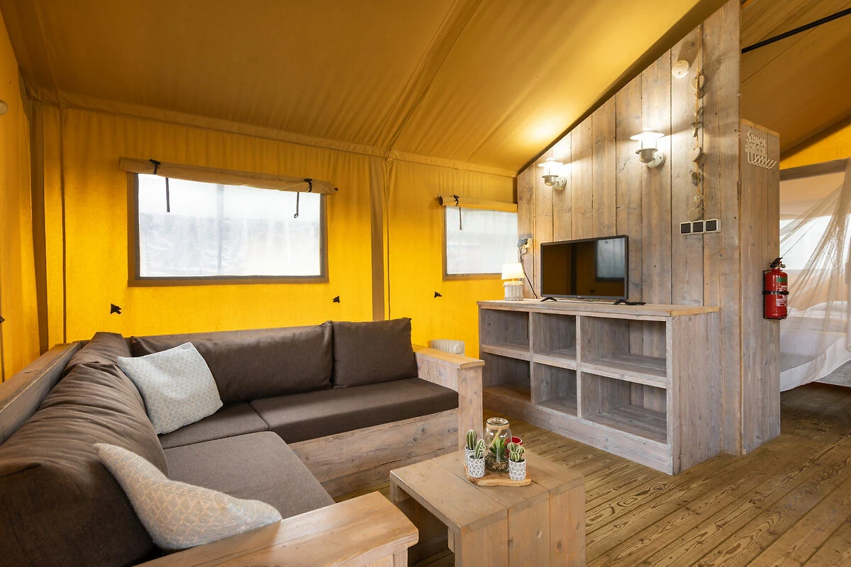 Das Safarizelt befindet sich im Erdgeschoss und ist komplett ausgestattet. Im Wohnzimmer finden Sie einen Smart-TV und in der Küchenzeile einen Kühlschrank mit Gefrierfach. Es gibt zwei Schlafzimmer, eines davon mit zwei Einzelbetten (diese können auch als Doppelbett aufgestellt werden) und ein Schlafzimmer mit einem Etagenbett oder zwei Einzelbetten. Das Badezimmer verfügt über eine Dusche und ein WC.