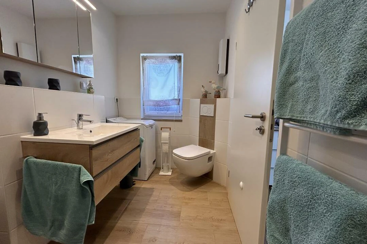 Sie finden ein modernes Bad mit ebenerdiger Dusche, Waschbecken, WC, Waschmaschine und Tageslicht vor. Hier finden Sie bei Ankunft eine kleine Auswahl an Hygieneartikeln vor.