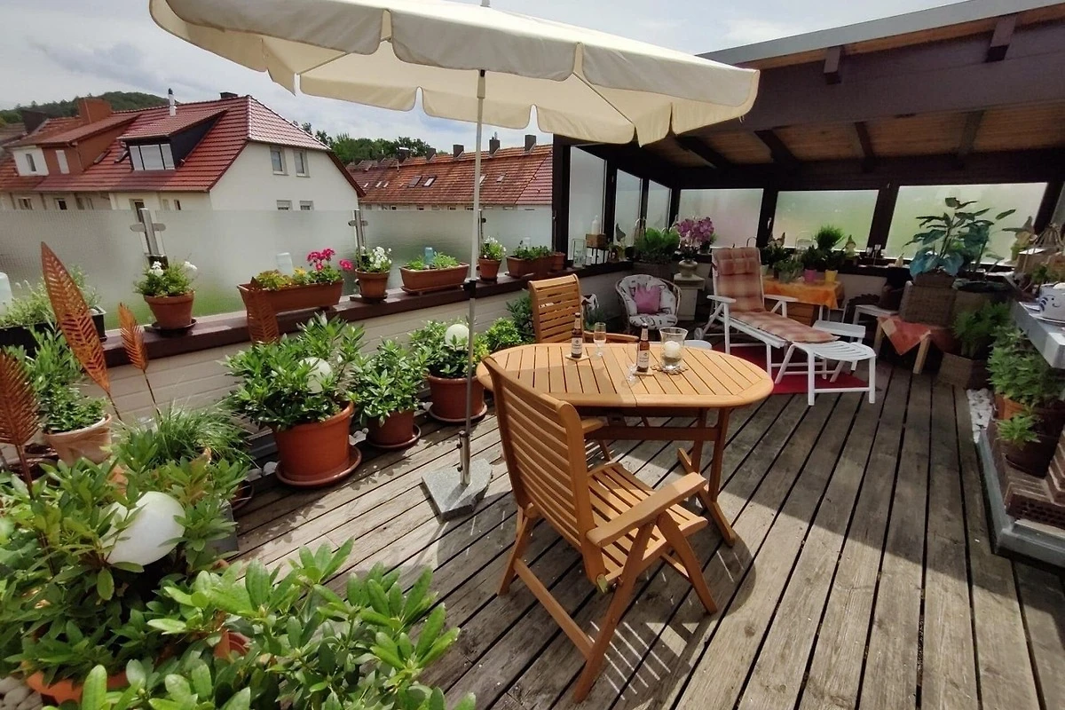 Gemütliche Ferienwohnung (70 qm) für 2 Personen im 1. Obergeschoss. Von der grossen Terrasse geniessen Sie den direkten Blick auf den Eschweger Leuchtberg. Separates Schlafzimmer mit gemütlichem Doppelbett (180 x 200 cm). Die voll ausgestattete Küche bietet Ihnen unter anderem Elektroherd mit Backofen, Spülmaschine, Mikrowelle und Toaster. Modernes Bad mit Dusche, Badewanne, WC und Fön.Sie wollen/müssen zwischendurch arbeiten? Dank kostenfreiem WLAN in der ganzen Wohnung kein Problem. Im Wohnzimmer können Sie dafür gern den grossen Schreibtisch mit modernem Bürostuhl nutzen.Dank der Top-Lage in einem ruhigen Wohngebiet ist die Ferienwohnung die perfekte Ausgangsbasis für Ihren Urlaub in Eschwege. Die historische Altstadt mit den fast 1.000 Fachwerkhäusern, Geschäften und Lokalen erreichen Sie genauso in wenigen Minuten zu Fuss, wie zwei Supermärkte oder den Bäcker. Aber auch für Ihre Urlaubsaktivitäten müssen Sie keine weiten Wege zurücklegen. Der Werratalsee, der Leuchtberg mit dem Bismarckturm und dem Kletterwald und auch der Werratal-Radweg sind gleich um die Ecke. Parken Sie Ihr Auto gern direkt vor dem Haus. Reisen Sie lieber mit der Bahn nach Eschwege? Kein Problem, die nächste Haltestelle des Eschweger Stadtbusses ist keine 100 Meter entfernt.