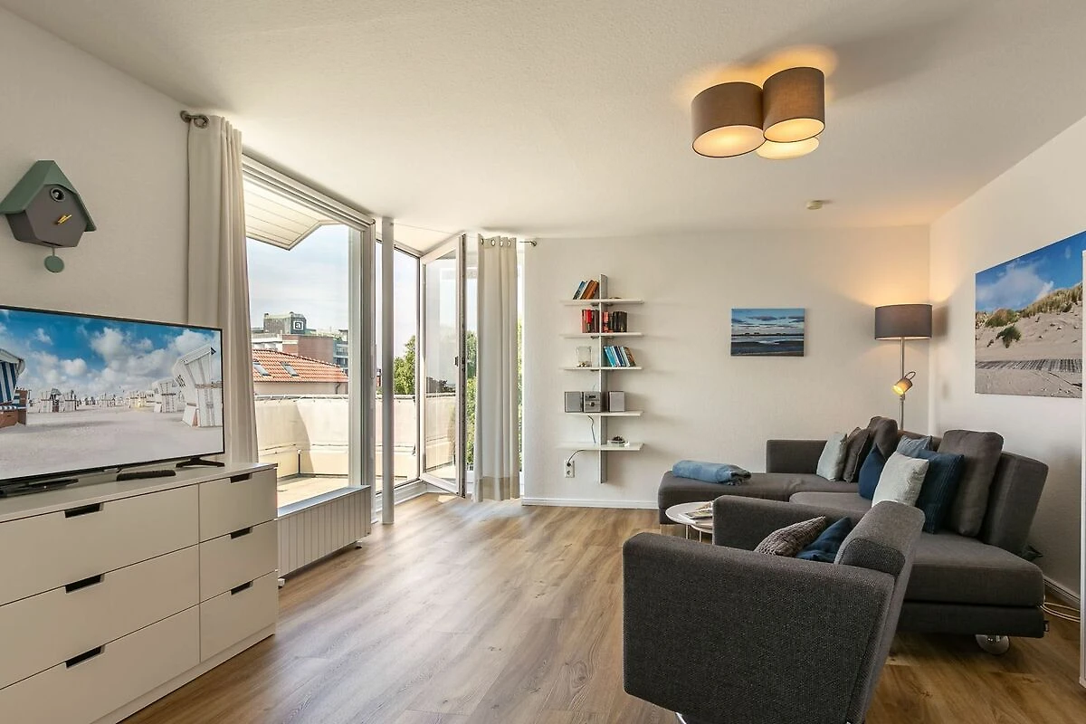 Wohnzimmer mit Ecksofa, Sessel, ausklappbarem Doppelbett (140x195cm), SMART-TV (Kabel) und Hifi-Anlage. Direkter Zugang zum sonnigen, möblierten Eckbalkon nach Südwesten mit herrlichem Ausblick auf die Seebrücke und kleinem Meerblick. Essecke mit Tisch und 4 Stühlen.