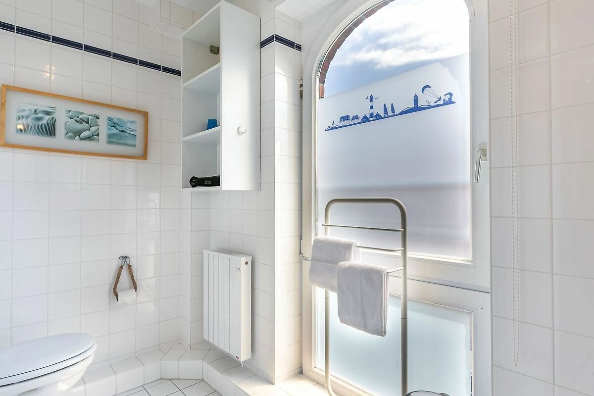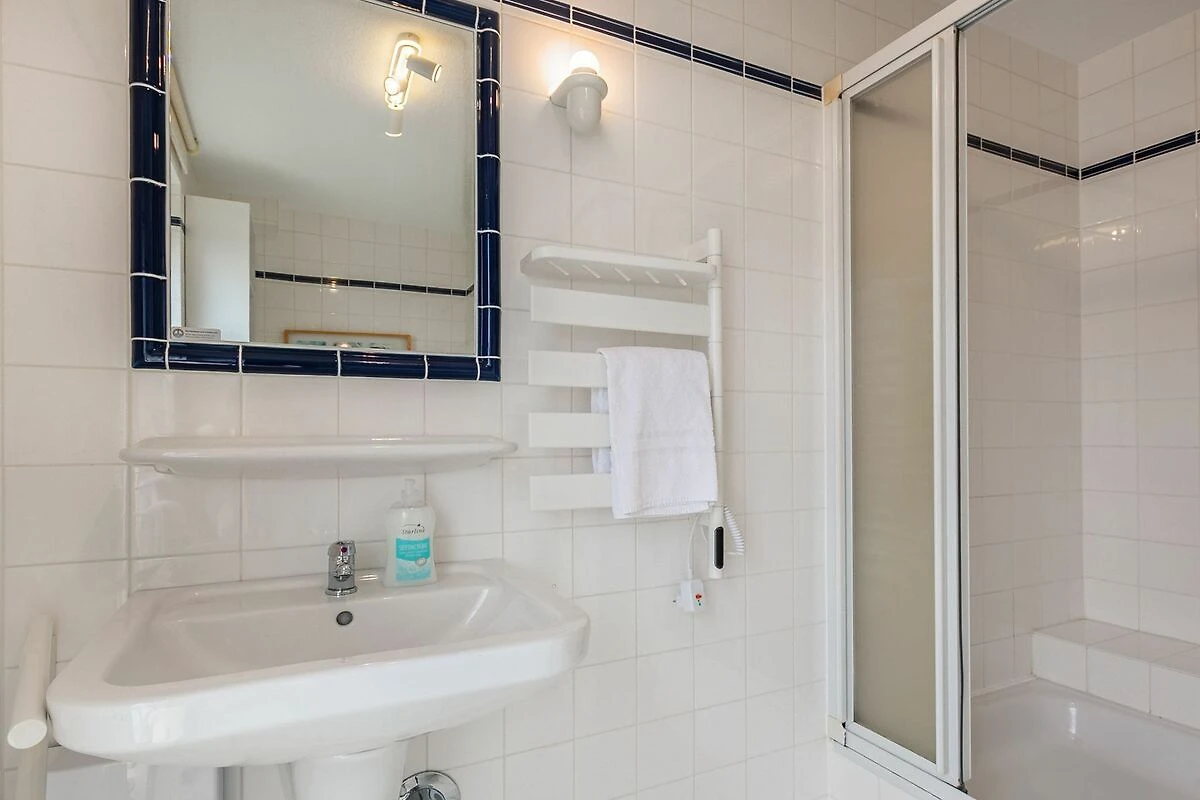 Badezimmer (Duschbad) mit Dusche, WC, elektrischer Heizung, Tageslicht und Föhn.