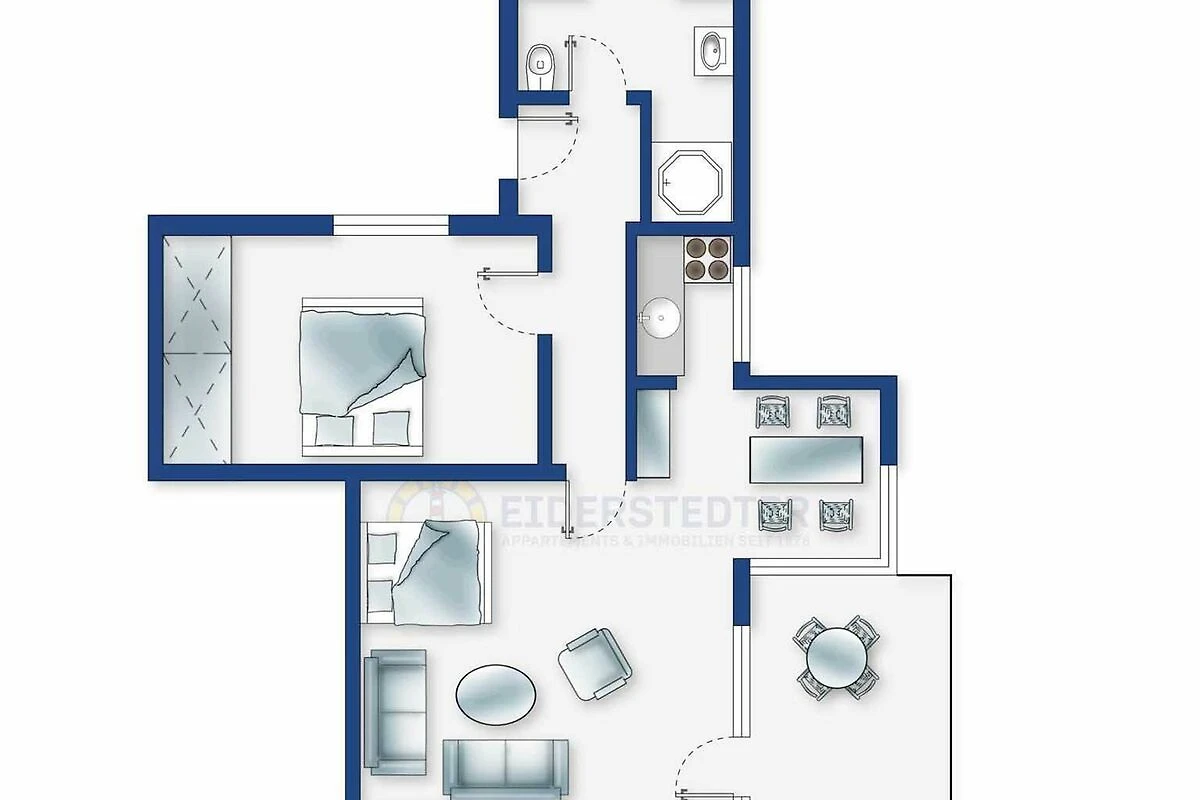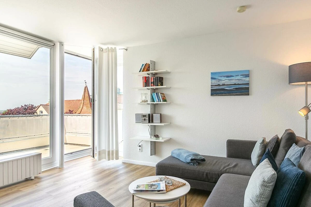 Charmante, sonnige 2-Zimmer-Ferienwohnung mit ca. 50 m² auf 1 Ebene (3. OG) für bis 4 Personen (Wohlfühlbelegung: max. 3 Erwachsene). Strand- und zentrumsnahe Lage im Ortsteil Bad in St. Peter-Ording. Zur Promenade, dem Strand, der Dünentherme und allen Restaurants und Geschäften des Kurzentrums sind es nur wenige Gehminuten. Balkon nach Südwesten mit herrlichen Ausblick über die Dächer von St. Peter-Ording bis zur Seebrücke am Strand und dem Meer.