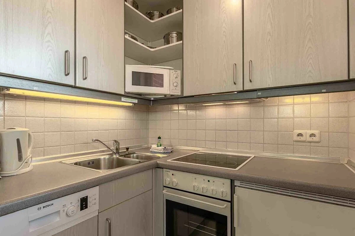 Kleine, halboffene Küche mit Backofen, Mikrowelle, Kühlschrank mit Gefrierfach und Geschirrspüler.