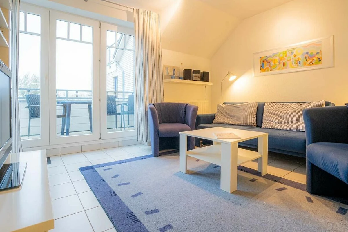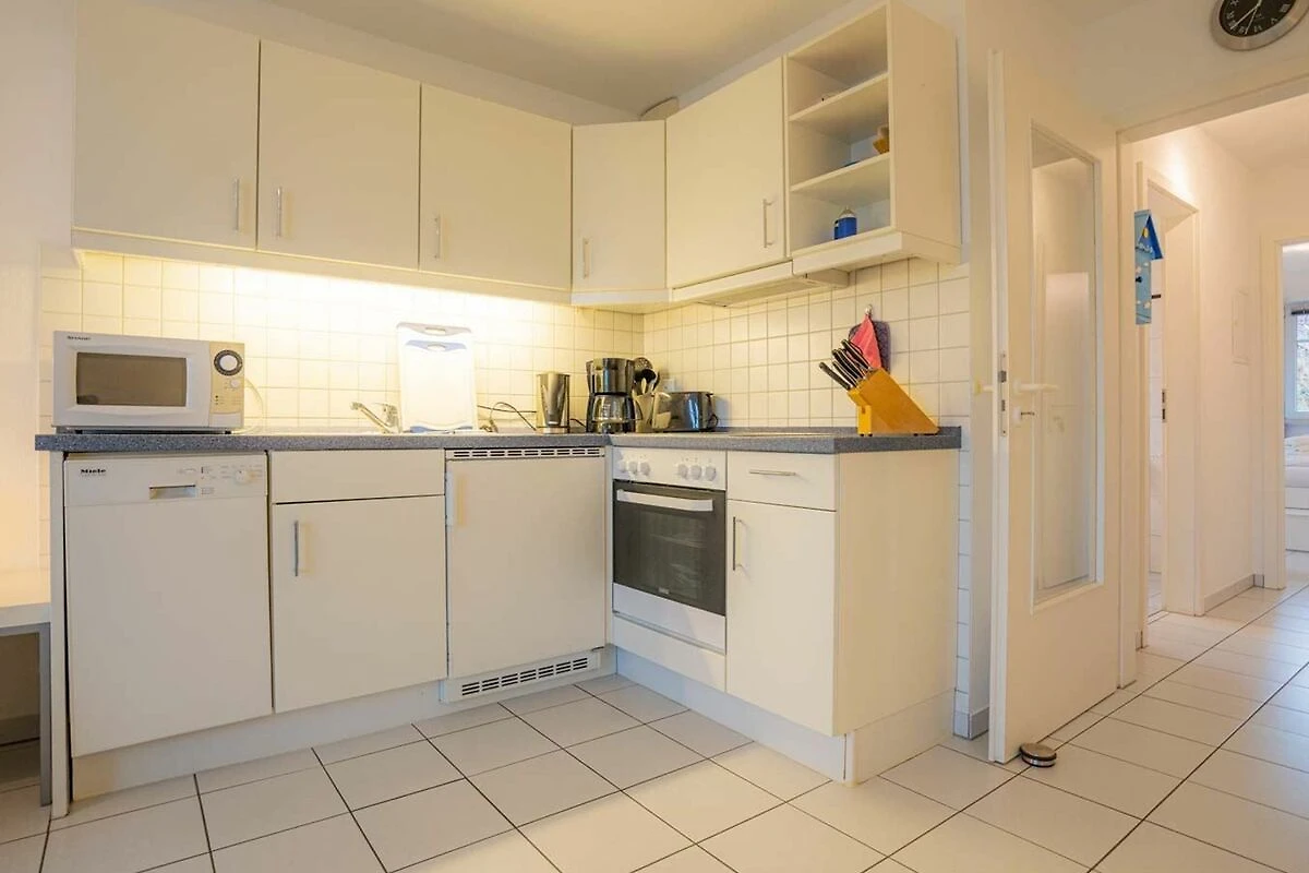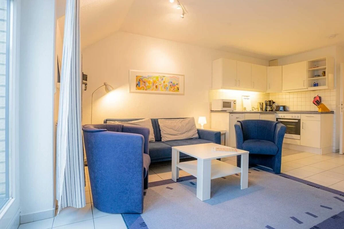 Wohnzimmer mit ausziehbarem Schlafsofa (170 x 190cm), 2 Sesseln, TV (Sat), DVD-Player, Stereoanlage mit CD-Player und Esstisch mit 4 Stühlen. Direkter Zugang zum windgeschützten, möblierten Südbalkon mit schönem Ausblick über den Deich in Richtung Meer. Offene Küche mit Backofen, Geschirrspüler, Kühlschrank mit Gefrierfach und Mikrowelle.