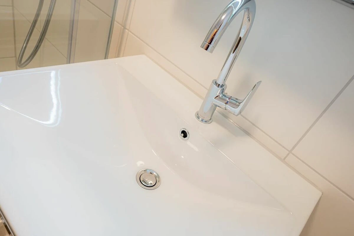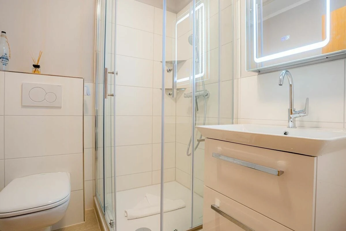 Badezimmer (Duschbad) mit Dusche, WC, Heizlüfter und Föhn.