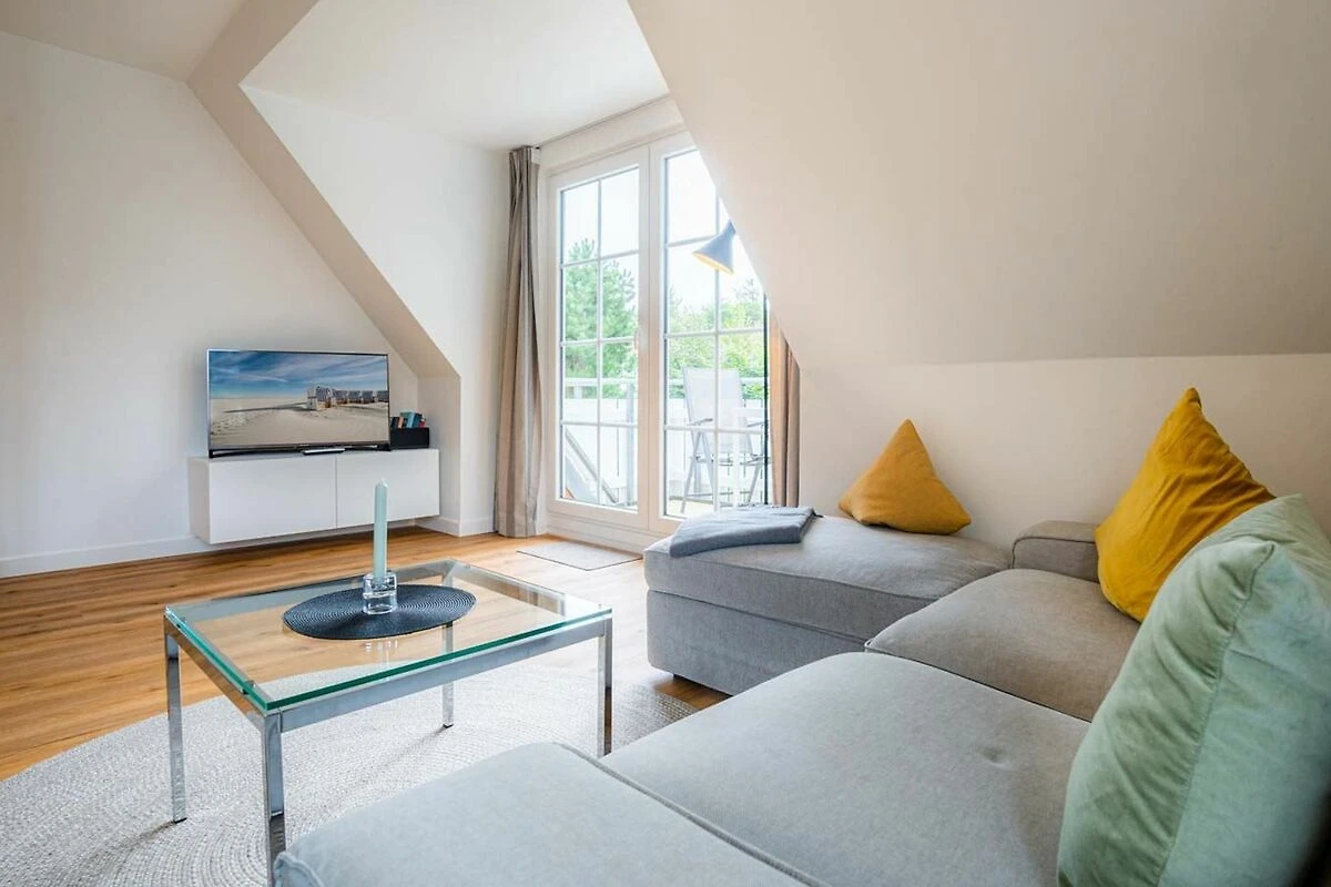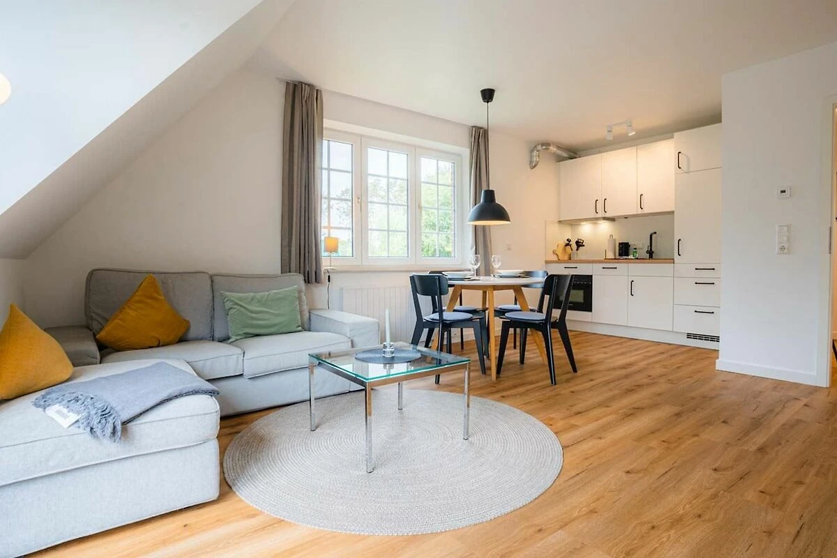 Wohnzimmer mit Ecksofa (2er) mit Polsterhocker, SMART-TV (Kabel) mit Radio und Esstisch mit 2 Stühlen. Direkter Zugang zum möblierten Balkon nach Süden. Offene Küche mit Backofen, Induktionsherd mit 2 Kochstellen, Mikrowelle, Kühlschrank mit Gefrierfach und Geschirrspüler.