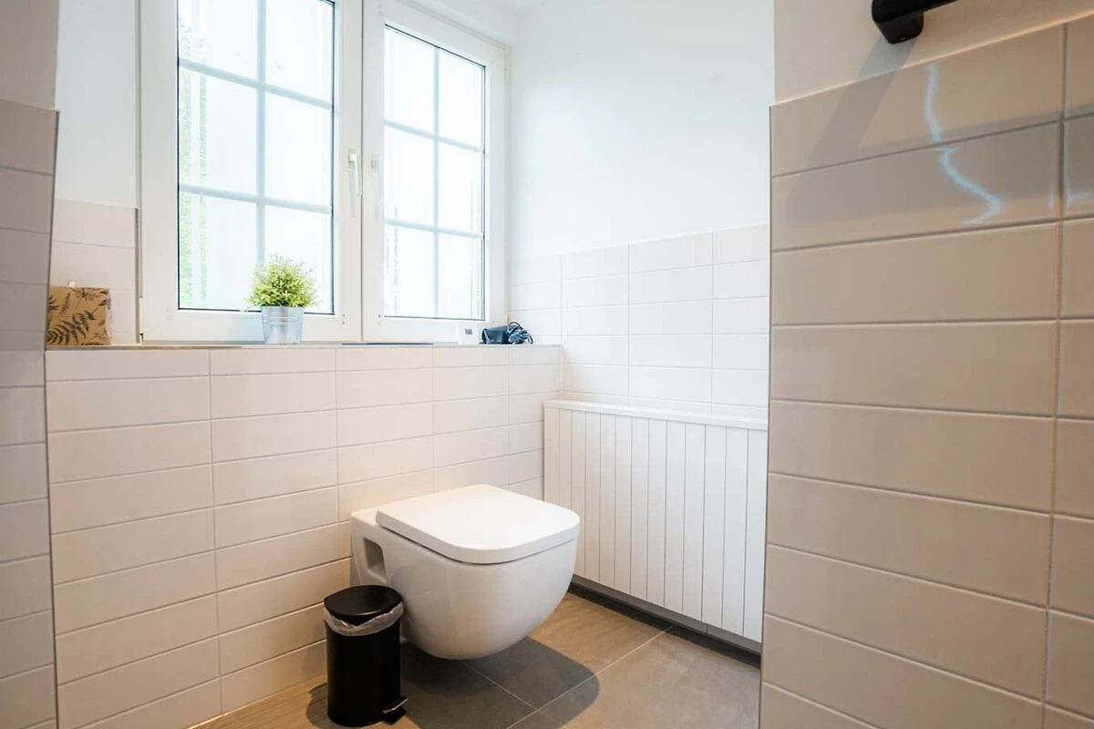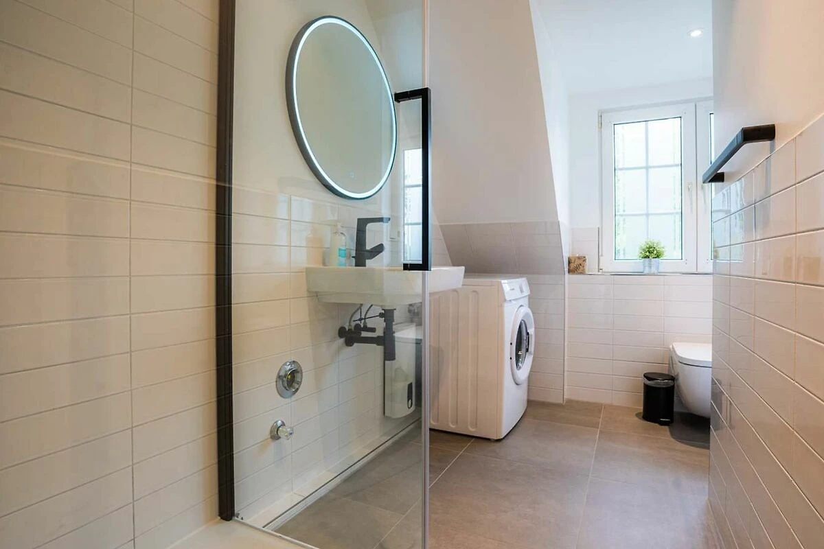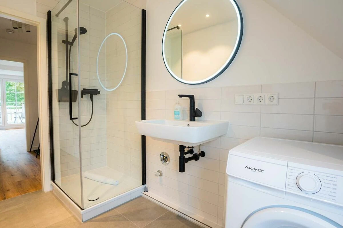 Badezimmer (Duschbad) mit ebenerdiger Dusche, WC, Waschmaschine (kostenlos), Föhn und Tageslicht.