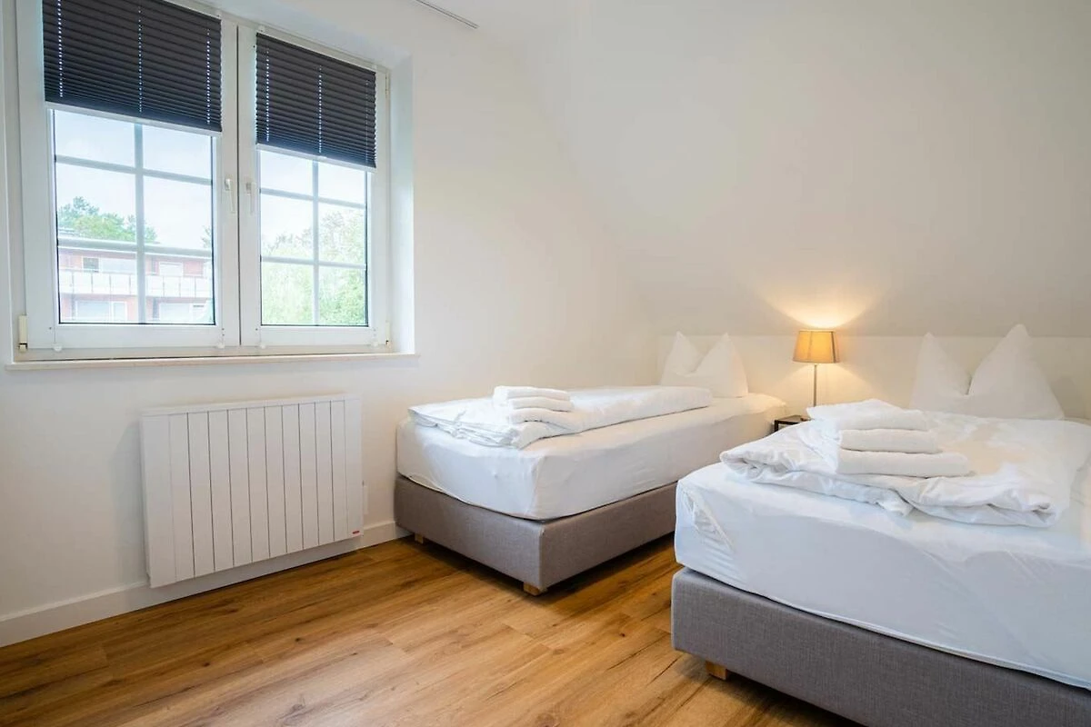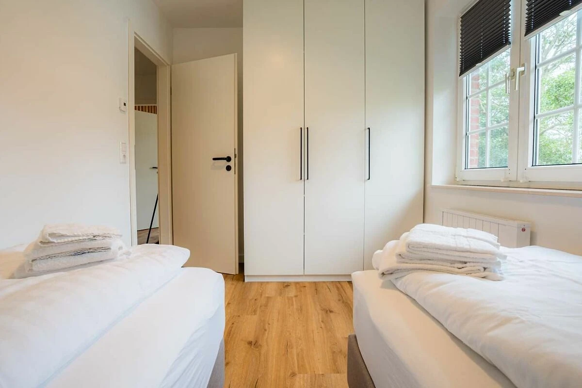 Schlafzimmer mit 2 Einzelbetten (je 90x200cm, Boxspring), Kleiderschrank und 2 Stühlen.