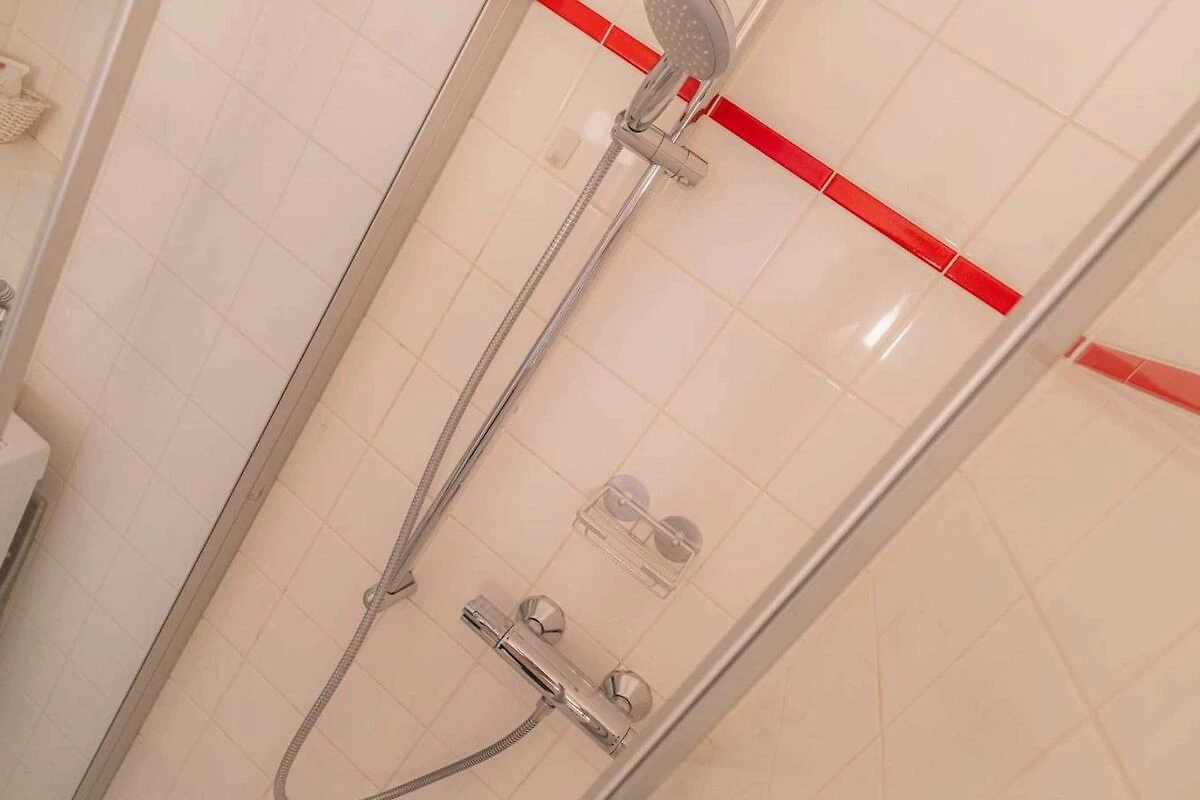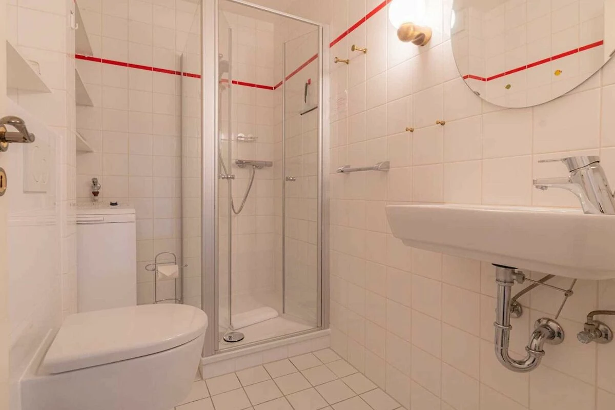 Badezimmer (Duschbad) mit Dusche, WC, Waschmaschine (TopLoader) und Föhn.