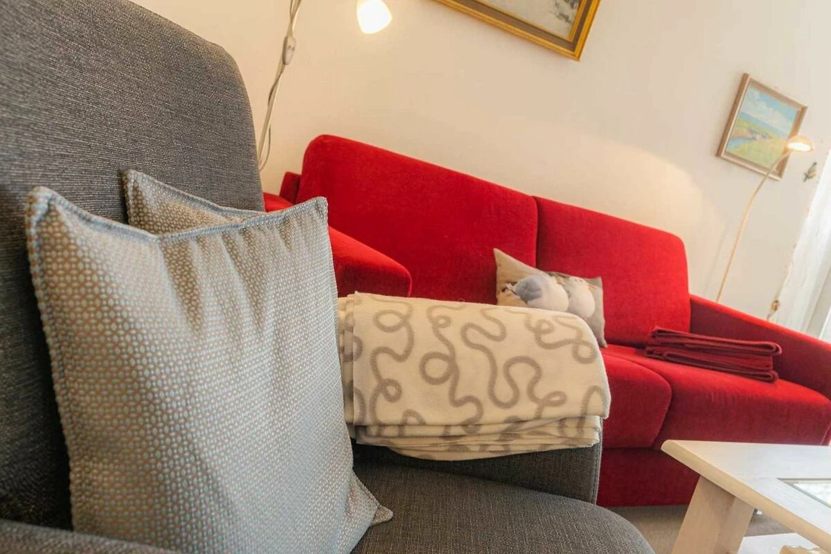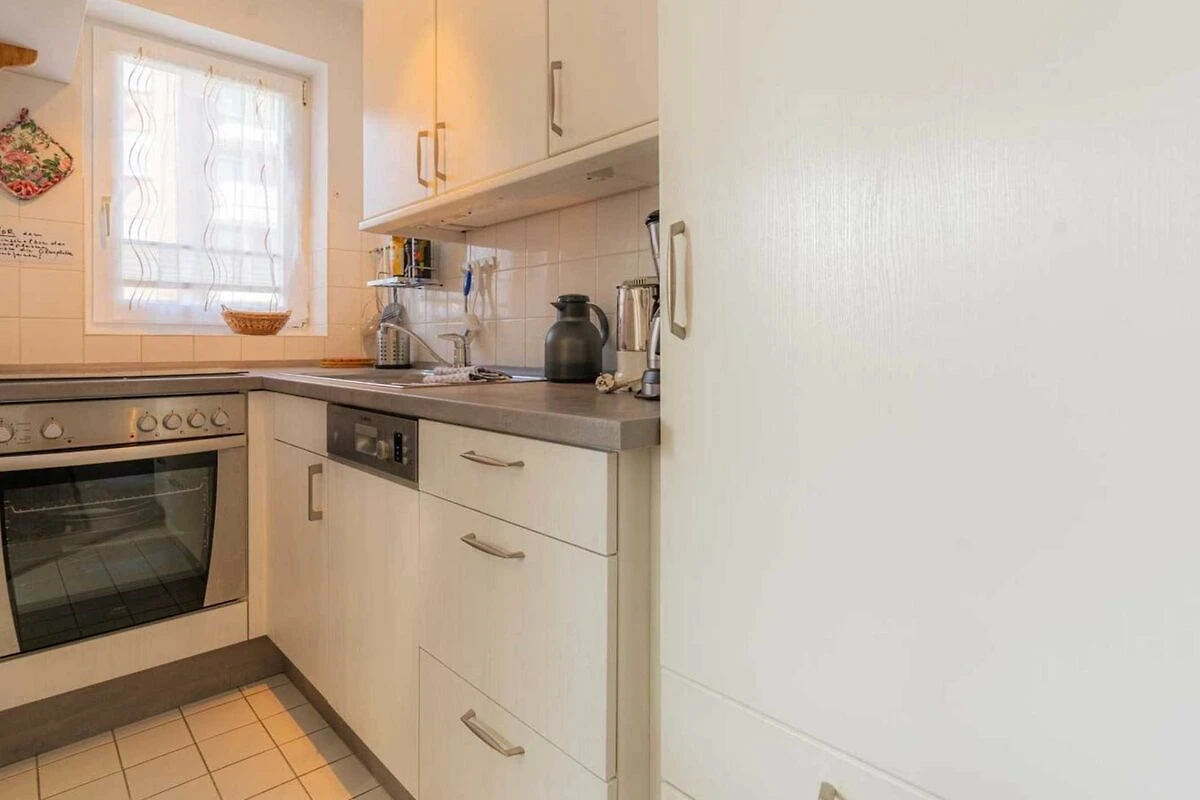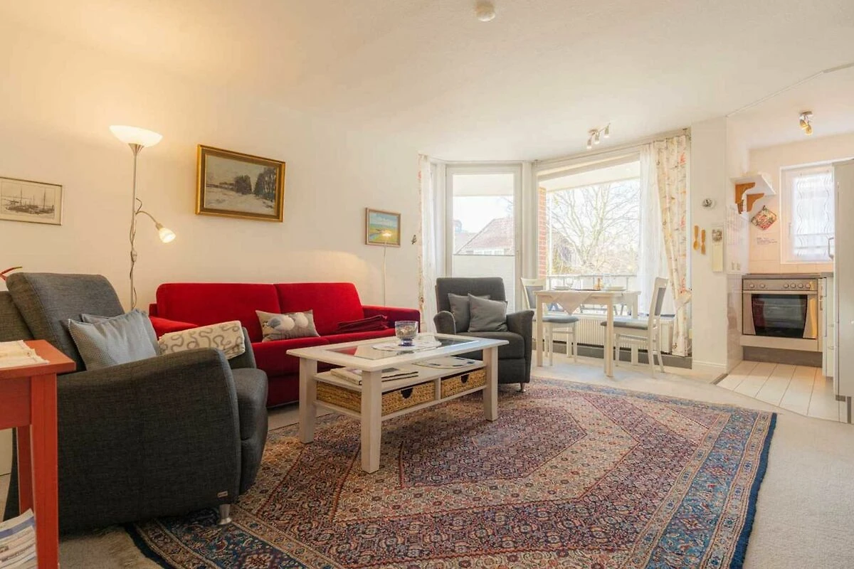 Wohnzimmer mit ausklappbarem (Schlaf-) Sofa (140x190cm), 2 Sesseln, Esstisch für 2-4 Personen, TV (Kabel) mit DVD-Player und Telefon. Direkter Zugang zum möblierten Eck-Balkon nach Westen und Norden. Offene Küche mit Backofen, Mikrowelle, Geschirrspüler und Kühlschrank mit Gefrierfach.