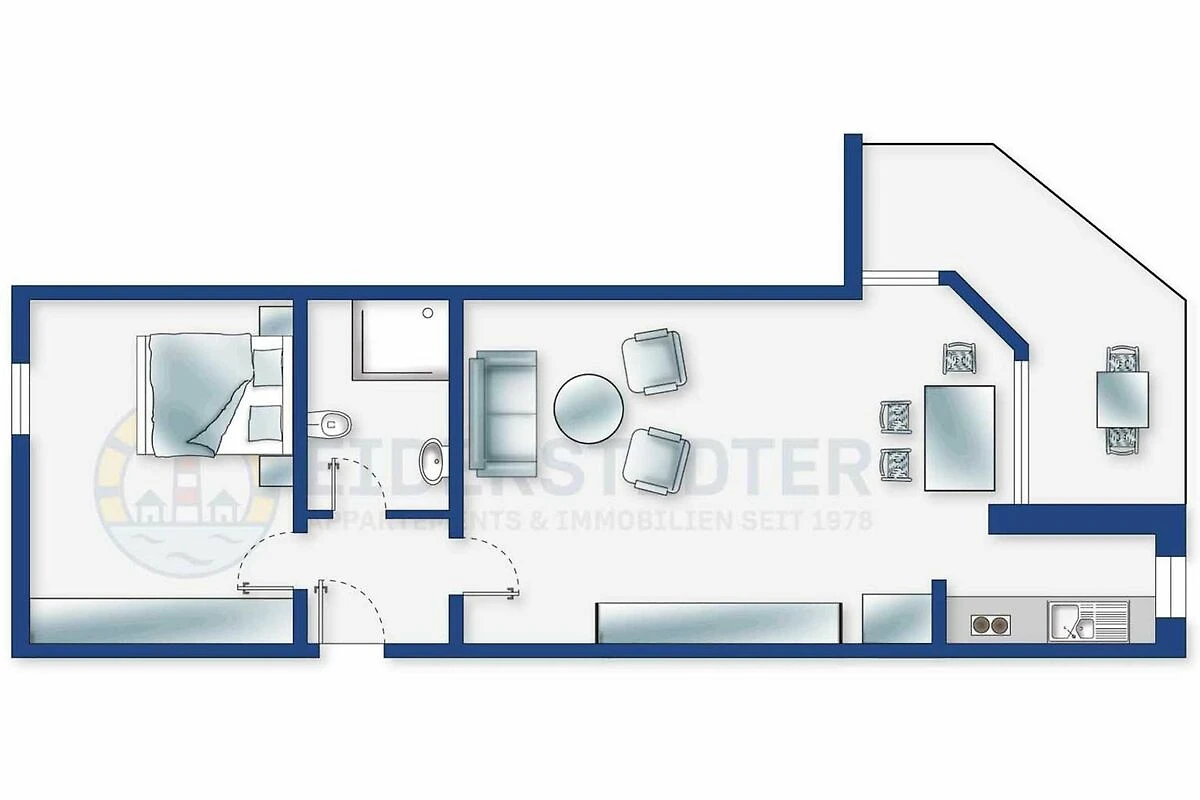 Strandnahe 2-Zimmer-Ferienwohnung mit ca. 45 qm auf 1 Ebene (1. OG) für bis 4 Personen. Zentrale Lage im Ortsteil Bad in St. Peter-Ording. Zur Promenade, dem Strand, der Dünentherme und allen Restaurants und Geschäften des Kurzentrums sind es nur wenige Gehminuten. Mit grossem Balkon.