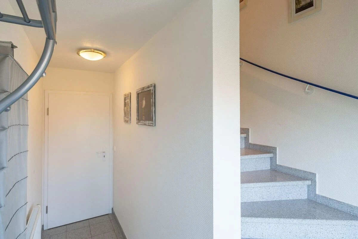 Flur mit Garderobe, Spiegel und Schuhregal im Eingangsbereich im 1. OG. Sehr praktisch, um Gummistiefel, Strandspielzeug und nasse Jacken nicht in den Wohnbereich mitnehmen zu müssen.