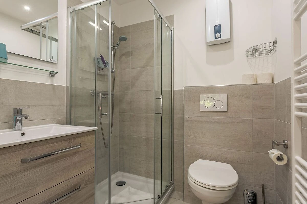 Badezimmer (Duschbad) mit Dusche, WC, Handtuchwärmer und Föhn.