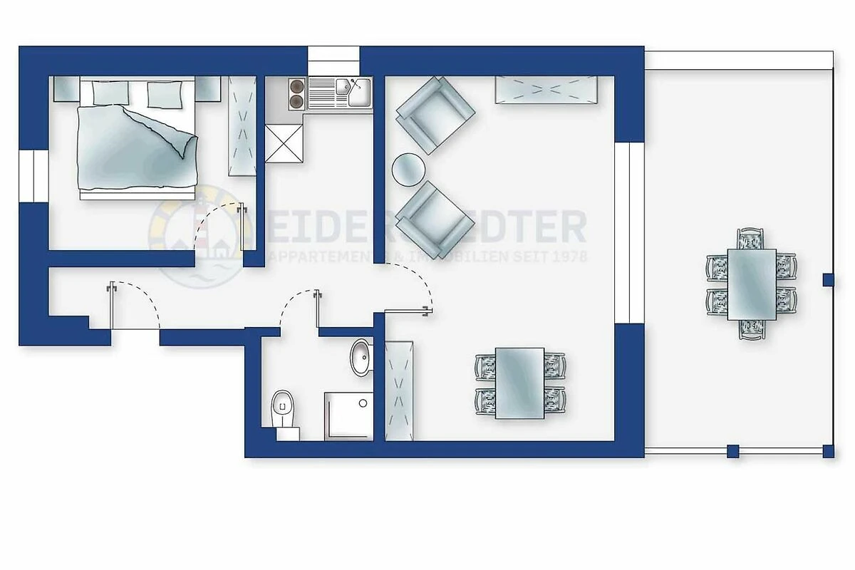 Moderne 2-Zimmer-Ferienwohnung mit ca. 54 m² auf 1 Ebene (EG) für bis zu 4 Personen. In ruhiger Lage im Ortsteil Dorf in St. Peter-Ording. Mit schönem grossem Garten. Viel Komfort und Entspannung erwarten Sie hier.