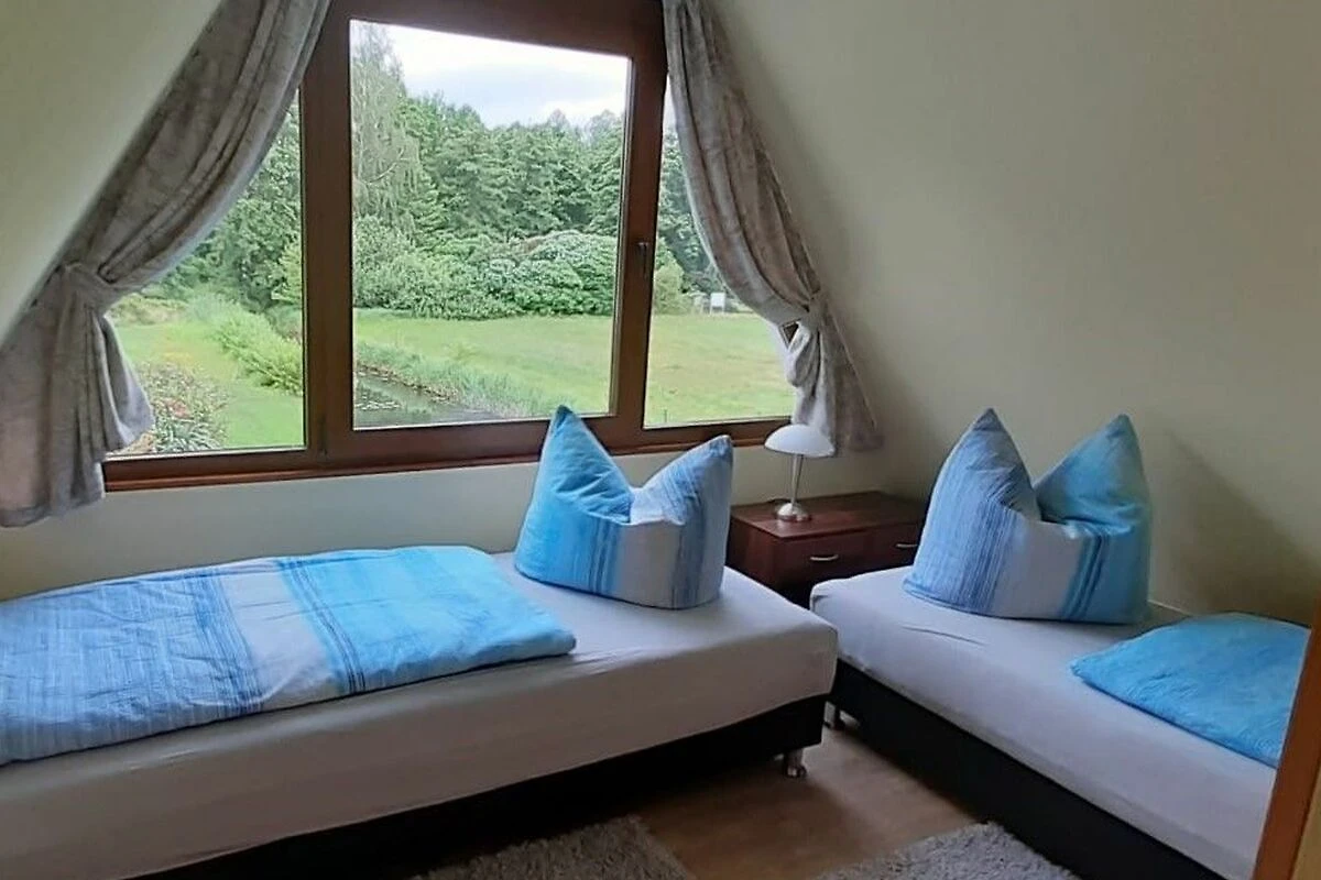 Im Obergeschoss befinden sich die Schlafzimmer. Ein Raum ist mit einem Doppelbett, der zweite mit zwei Einzelbetten eingerichtet. Die Einzelbetten können leicht zu einem Doppelbett zusammengestellt werden.