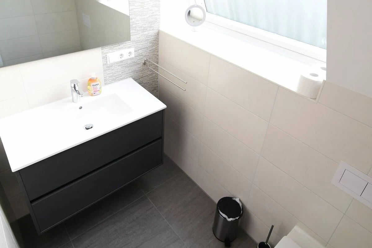 Das hellgeflieste Bad ist mit einer ebenerdigen Dusche, einem Waschtisch mit Wandspiegel, einem Haartrockner und einer Toilette ausgestattet.