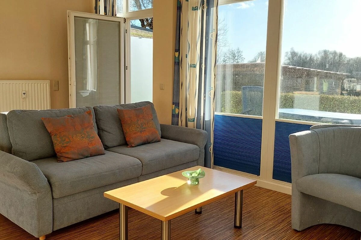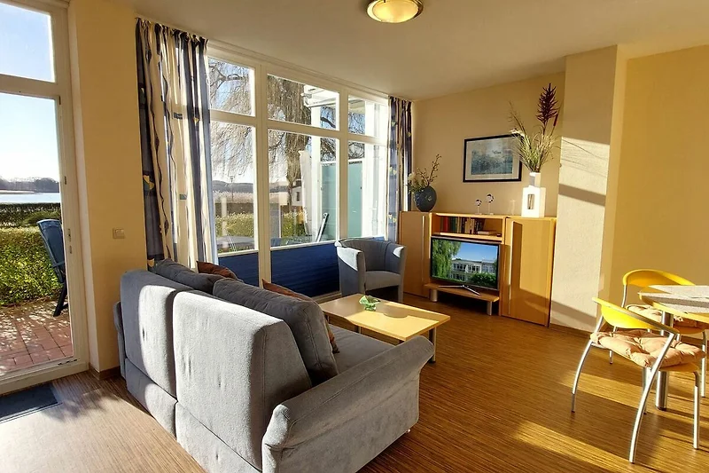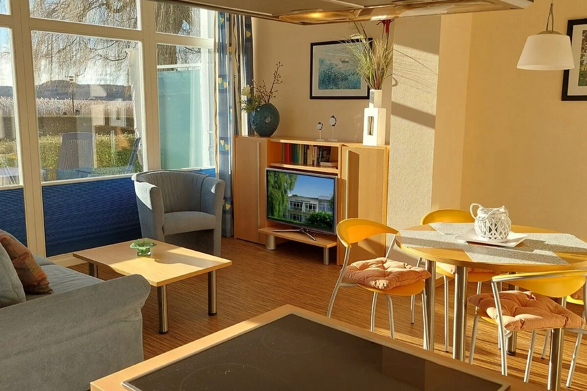 Der lichtdurchflutete Wohn- und Essbereich verfügt über ein gemütliches Sofa (mit Schlaffunktion), einen Smart-TV, eine kleine Hifi-Anlage und einen Essbereich mit 4 Sitzgelegenheiten.