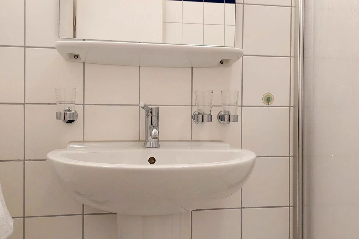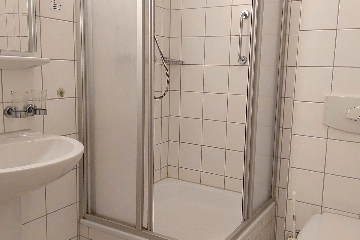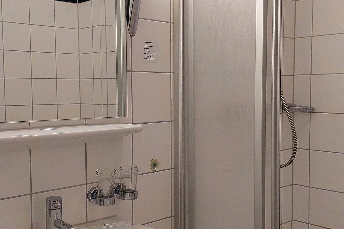 Im Badezimmer befindet sich eine Dusche, WC und ein Waschtisch samt Kosmetikspiegel und Fön.