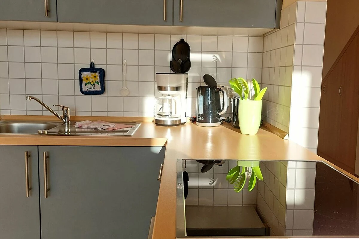Die neue Kochzeile ist mit Kühlschrank, Backofen, Cerankochfeld, Kaffeemaschine, Wasserkocher, Toaster und diversen Küchenhelfern ausgestattet.