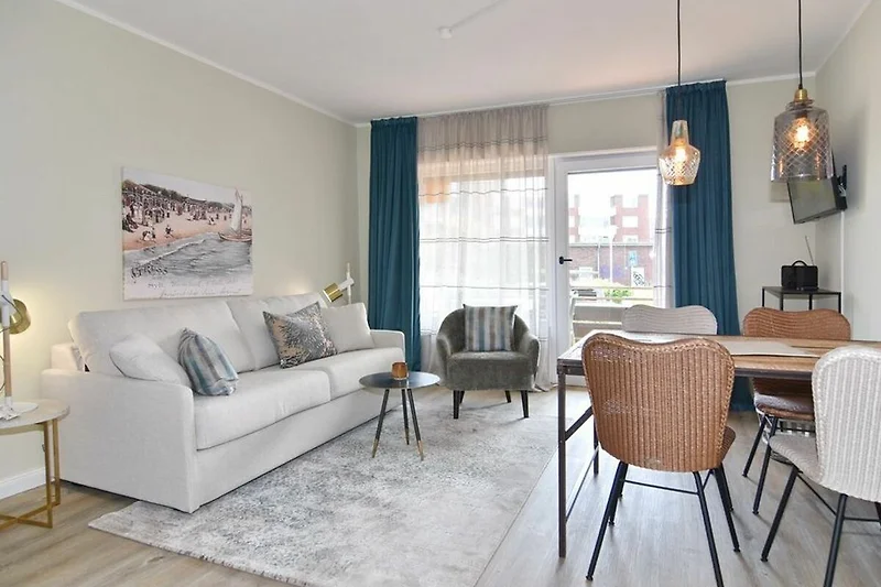 Moderne 2-Zimmer-Ferienwohnung mit Südbalkon für max. 2 Personen in Strandnähe. Ca. 57 m² im Haus Störtebeker. EG: Sonniges Wohnzimmer mit Schlafcouch, kleinem Sessel und Esstisch für 4 Personen, Flat-TV, Radio, Südbalkon mit Balkonmöbeln, separate, kleine Küche mit Mikrowelle und Geschirrspüler, UG: grosses Schlafzimmer mit Boxspringbett (Liegeflächen je 90 x 200), Flat-TV, Duschbad/WC. PKW-Freistellplatz Nr. 2. Bettwäsche und Handtücher auf Bestellung. Tierhaltung verboten/Nichtraucherwohnung.