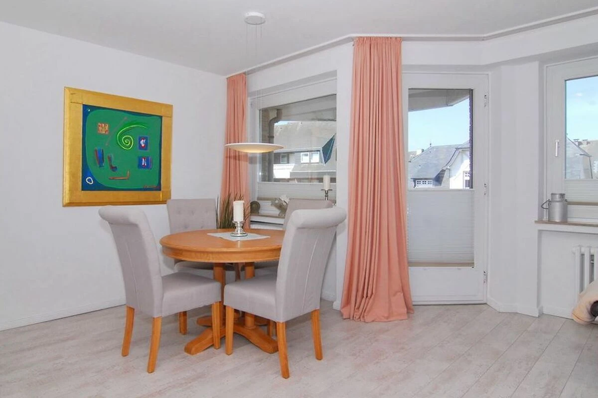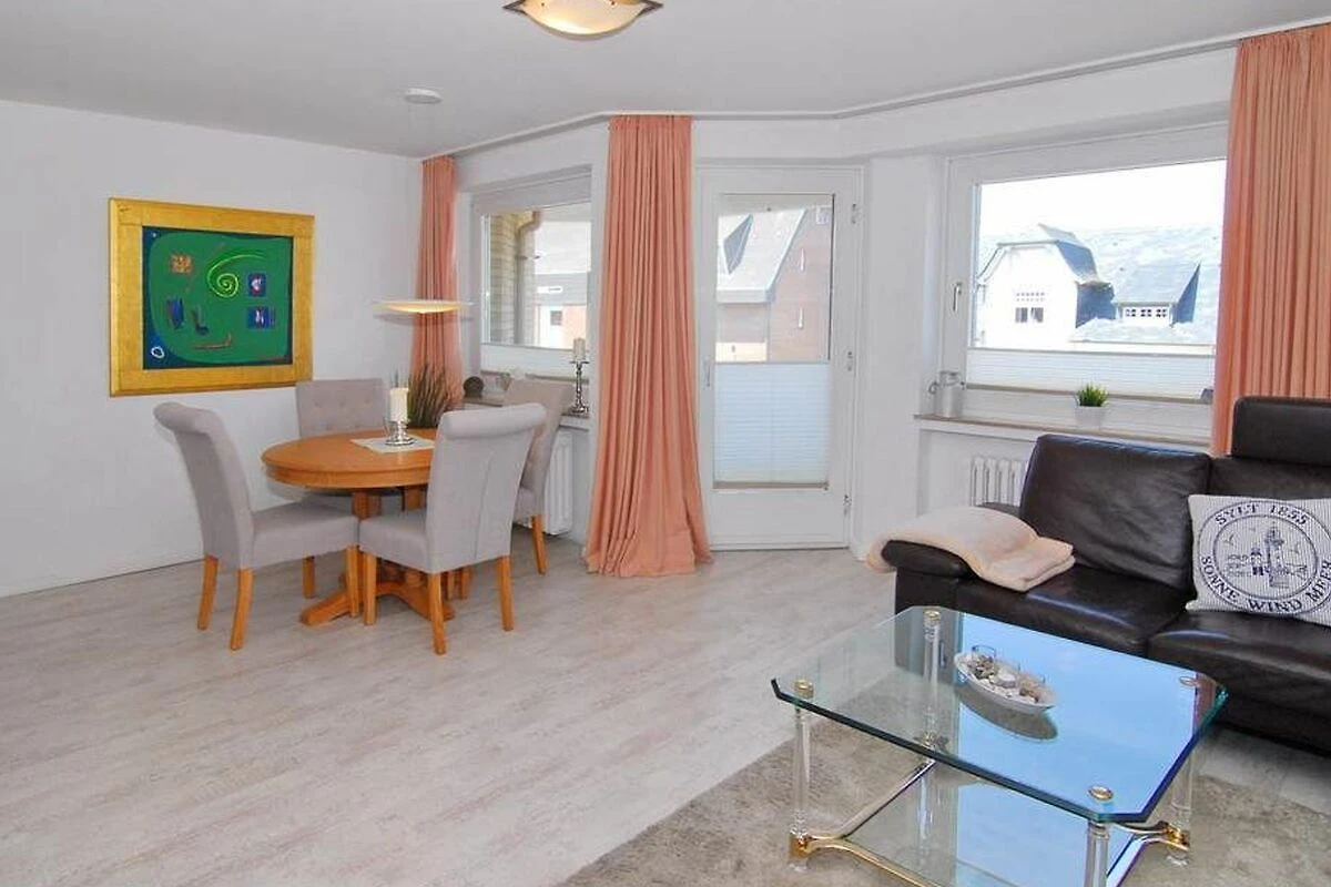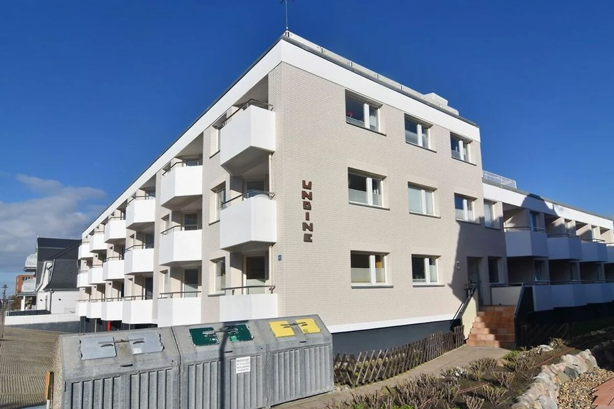 3-Zimmer-Ferienwohnung, ca. 65m², 1. OG, im Haus Undine. Nichtraucher-Whg. ![nbsp][nbsp]Wohnzimmer mit Eckcouch, Essplatz, Flat-TV, Stereoanlage mit Ipod-Station, Playstation 2, W-Lan, Westbalkon, separate Küche mit Geschirrspüler, Backofen und Nespresso-Maschine. 1 Schlafzimmer mit Doppelbett und Flat-TV (Hotelsafe vorhanden), 1 Schlafzimmer mit Doppelbett (160x200) und Flat-TV, Duschbad / WC mit Föhn. Tierhaltung ist nicht gestattet. Bettwäsche und Handtücher sind zur Anreise aufgezogen. Garagenstellplatz Nr. 39 inklusive (Garagenöffner bei Anreise im Büro Riel).