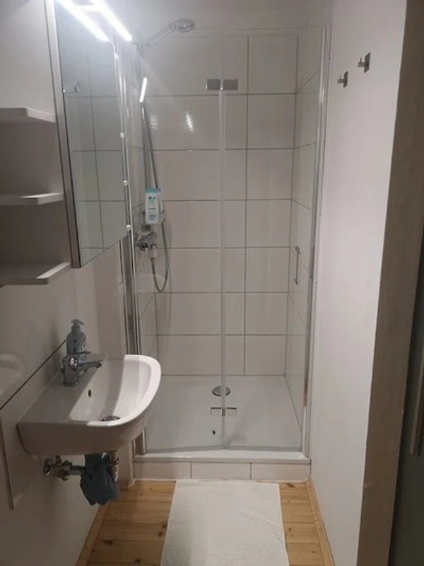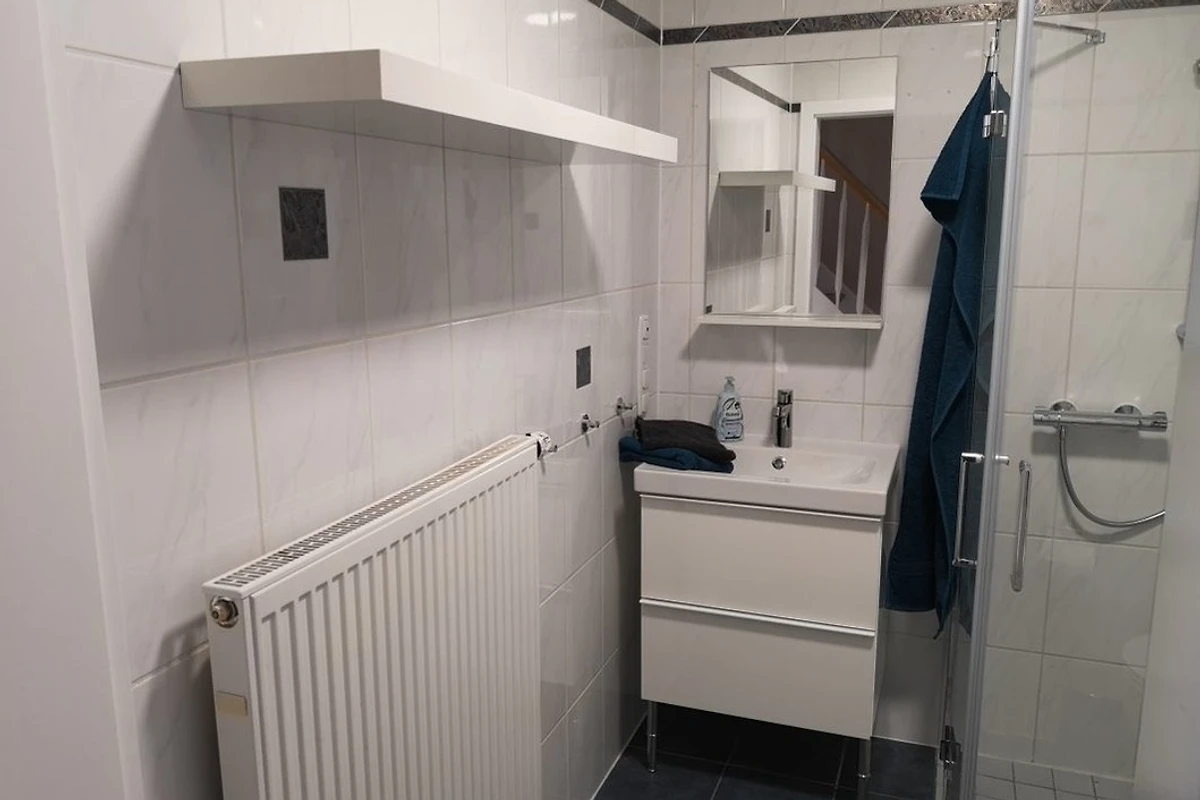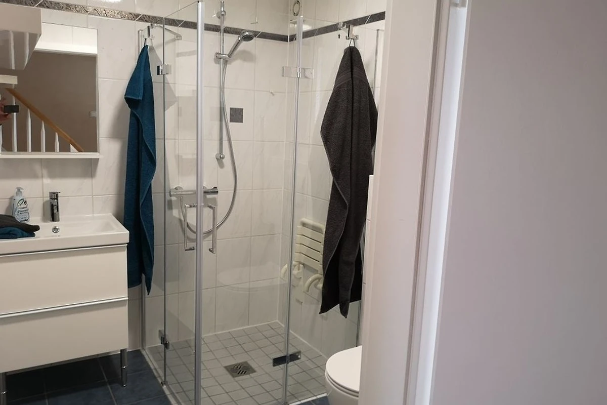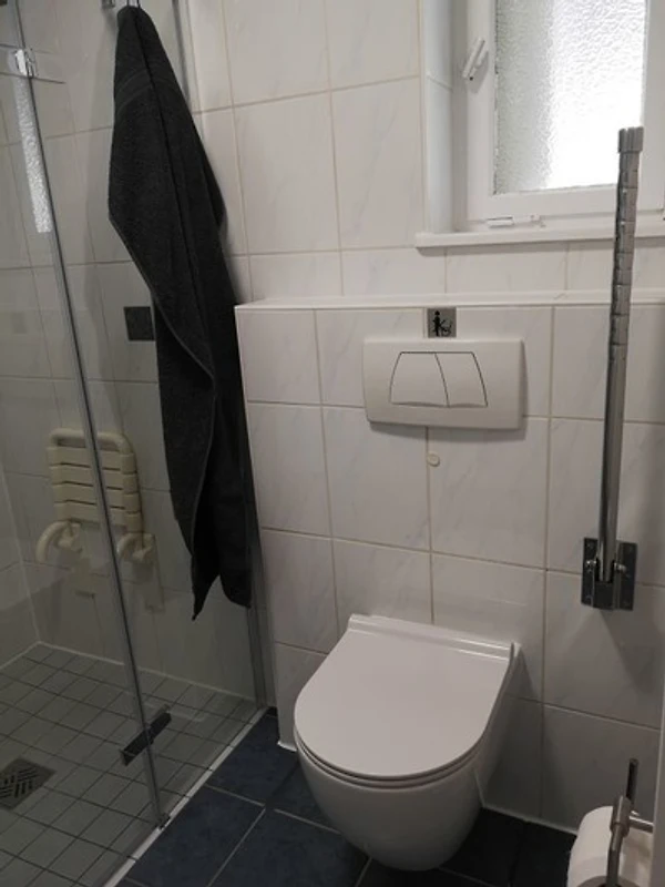 Das Badezimmer im unteren Bereich ist mit einem Duschsitz (siehe Bilder) ausgestattet und die Toilette ist etwas höher angebracht, damit es Menschen mit Beinträchtigungen leichter haben.