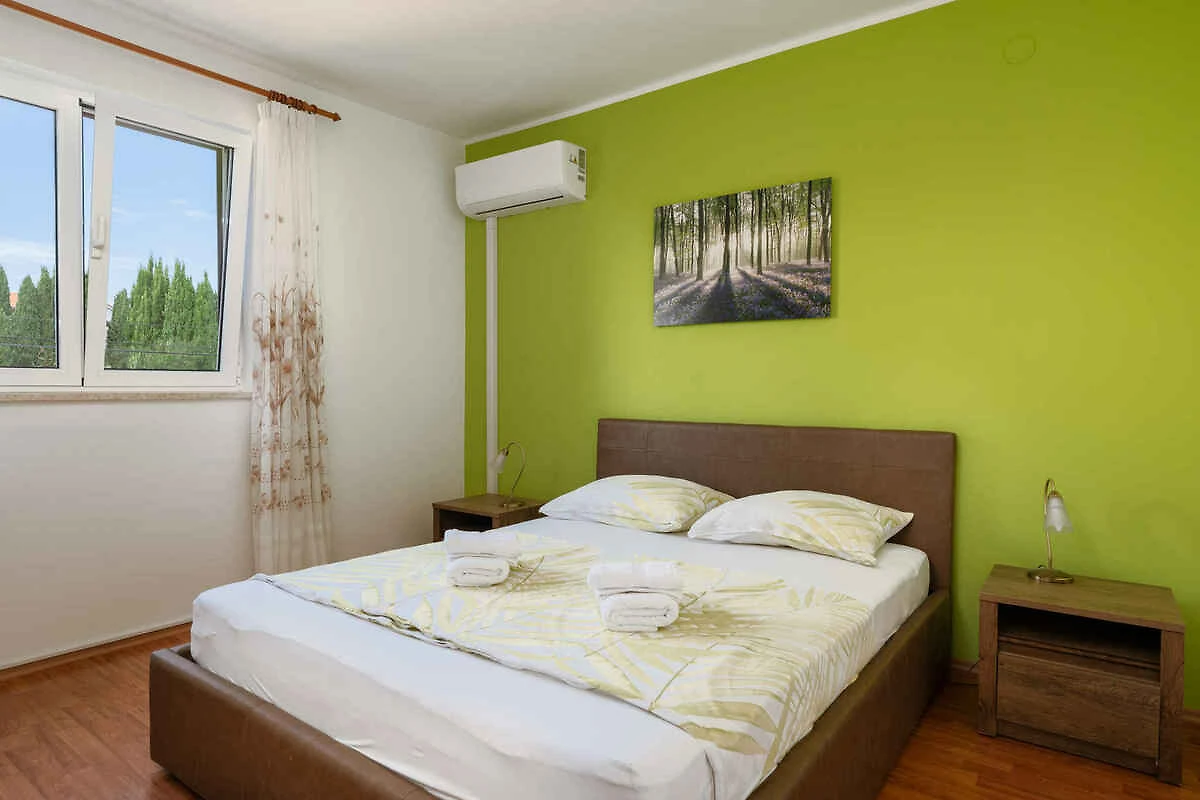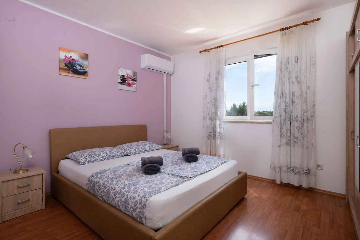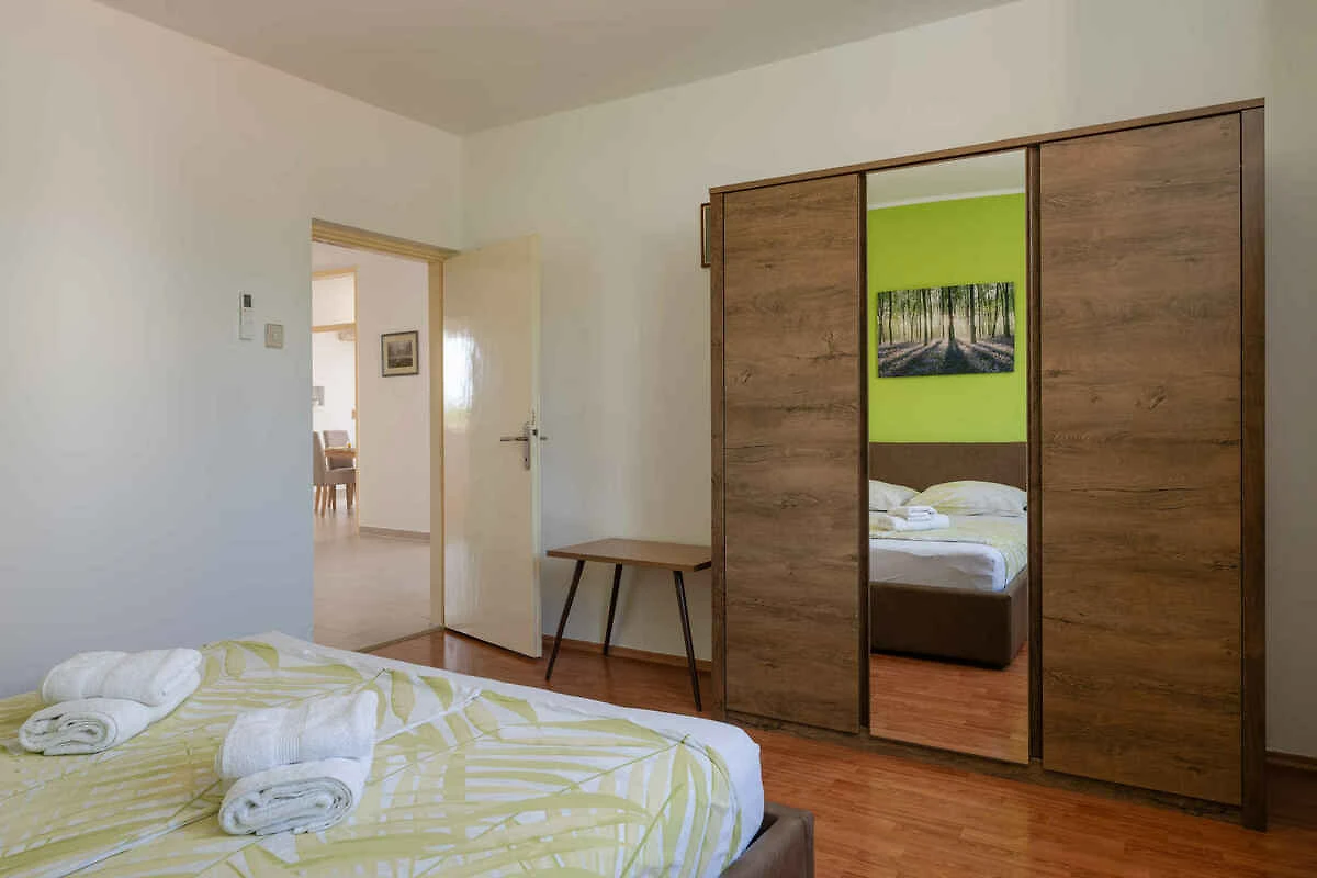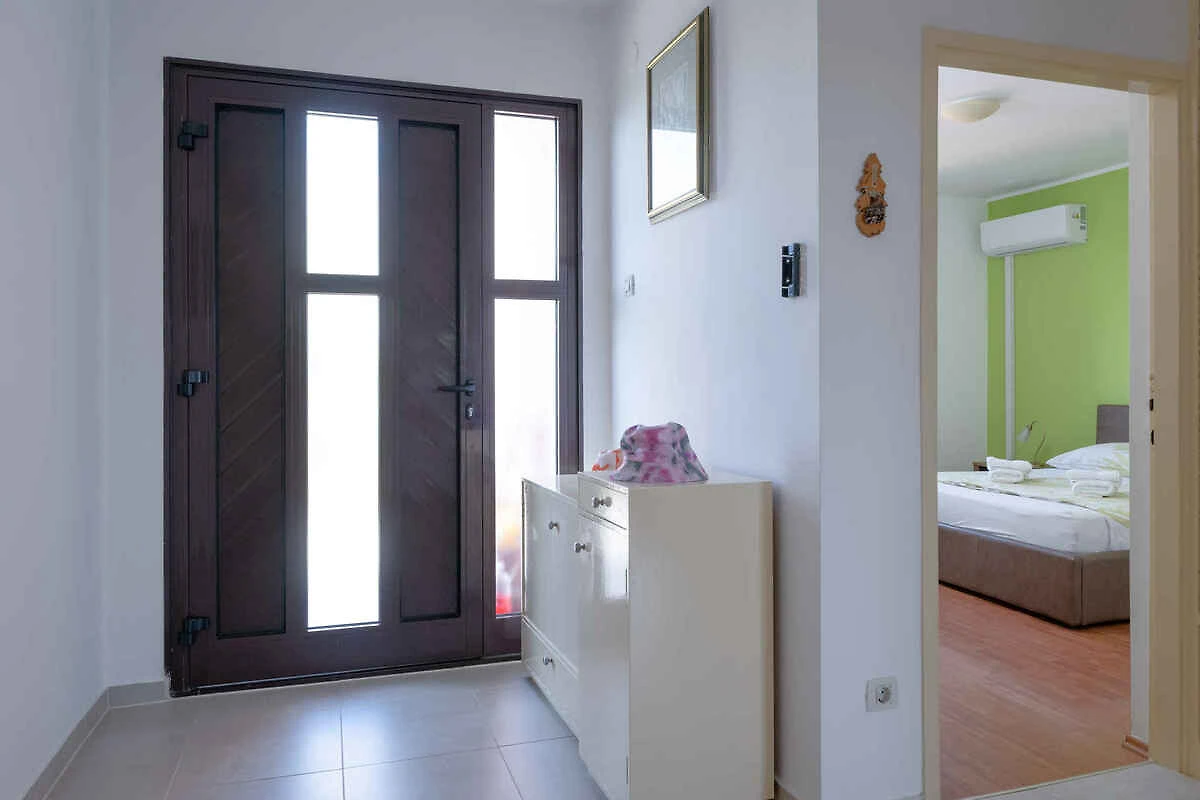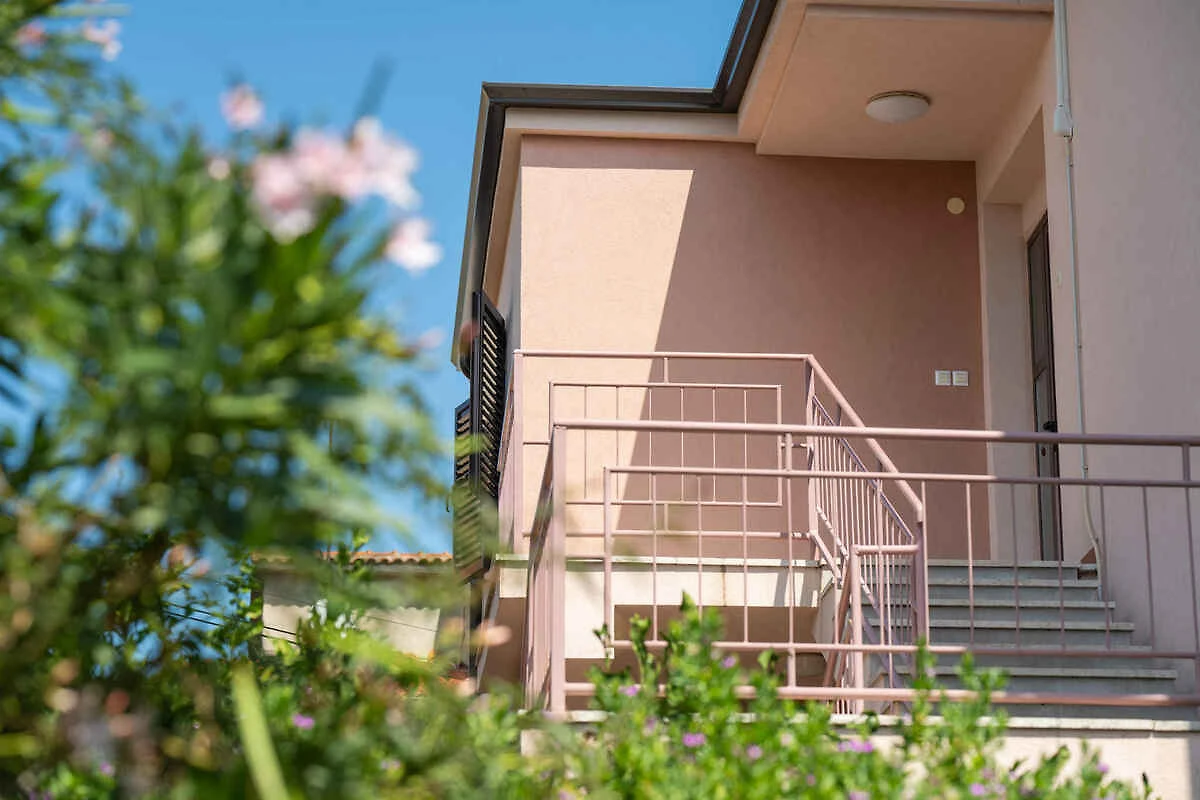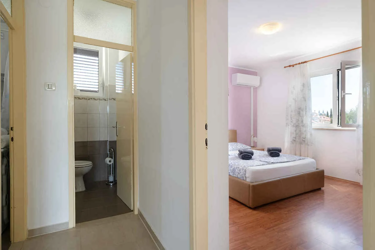 Medulin. Die Ferienwohnung befindet sich auf einem geschlossenen Gartengrundstück mit Wiese, Blumen, Sträuchern und Bäumen. Der Vermieter wohnt ständig im Haus, nutzt jedoch einen separaten Eingang. Die Zufahrt erfolgt über eine Nebenstrasse. Parkplatz (für 1 Pkw) auf dem Grundstück.