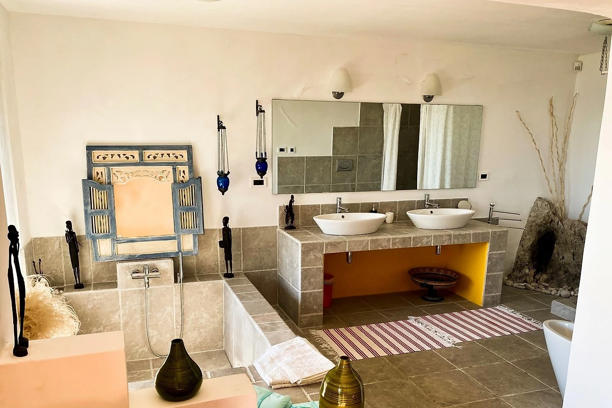 Es verfügt über ein grosses Doppelbett (1,80m) und eine Schlafcouch. Das angeschlossene Badezimmer ist mit einer luxuriösen Jacuzzi Badewanne und einer Doppeldusche ausgestattet. Durch grosse Fenster können Sie auch vom Bad aus den Blick aufs Meer geniessen.
