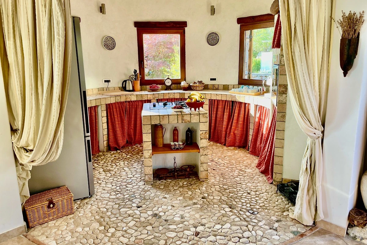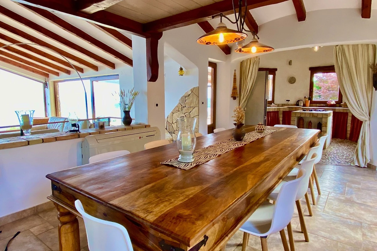 Das Zentrum bildet ein massiver Holztisch, an dem 10 Personen gemütlich sitzen können. Auch vom Esszimmer gibt es einen direkten Zugang zur Terrasse. Die Küche ist in einer alten, istrischen Bauart als "Ka¸un" errichtet worden. Es handelt sich hierbei um eine traditionelle, runde Steinküche deren Besonderheit das am Boden befindliche Mosaik aus Kieselsteinen ist.