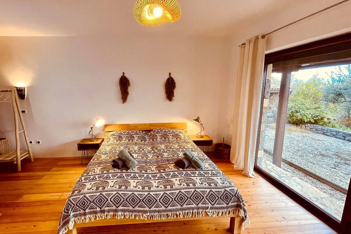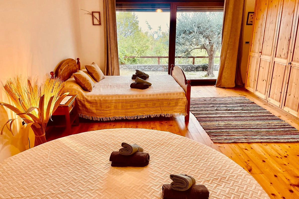 Hier befinden sich drei gemütliche und exklusiv eingerichtete Schlafzimmer, jedes mit eigenem Bad, Klimaanlage und wunderschönem Ausblick aufs Meer. Alle Zimmer haben direkten Zugang zu einer Terrasse mit alten Olivenbäumen und einer überdachten Pergola mit Kamin.