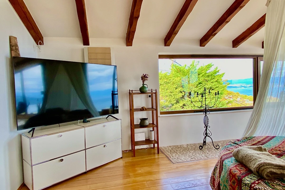 Es verfügt über ein Doppelbett (1,60m) und ein grosses, rundes Bett (Durchmesser 2,10m). Das angeschlossene Bad ist mit einer Dusche ausgestattet. Ein besonderes Stilelement ist das traditionelle "istrische" Fenster, welches vom Bad zum Schlafzimmer hin geöffnet werden kann und einen herrlichen Blick aufs Meer ermöglicht.