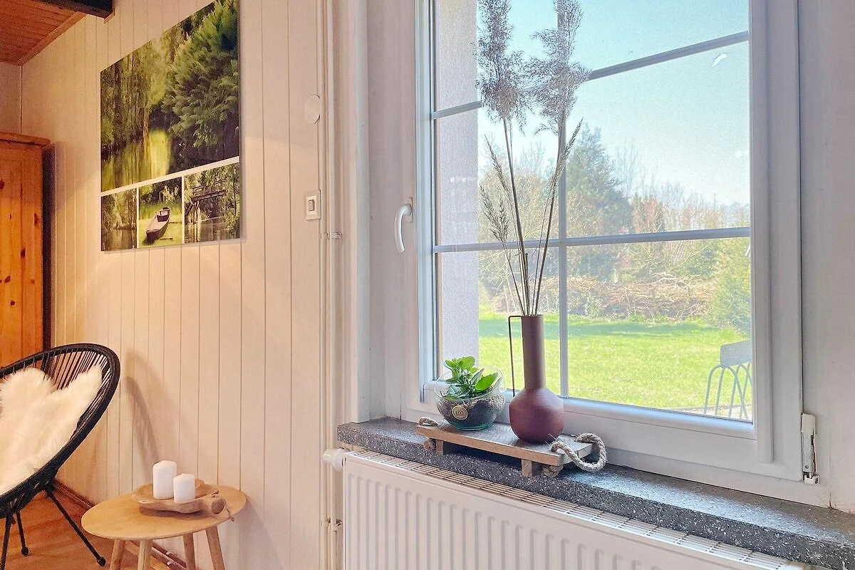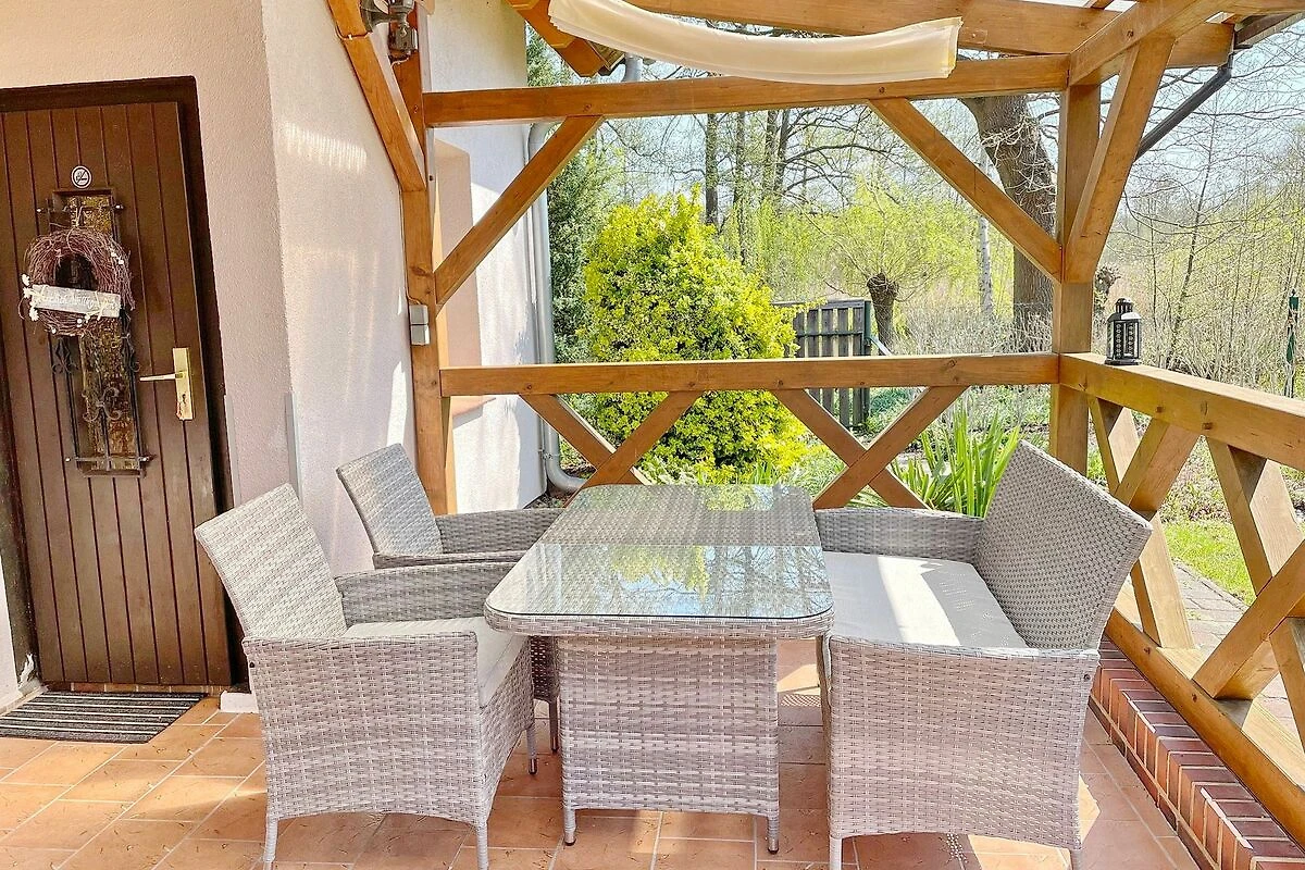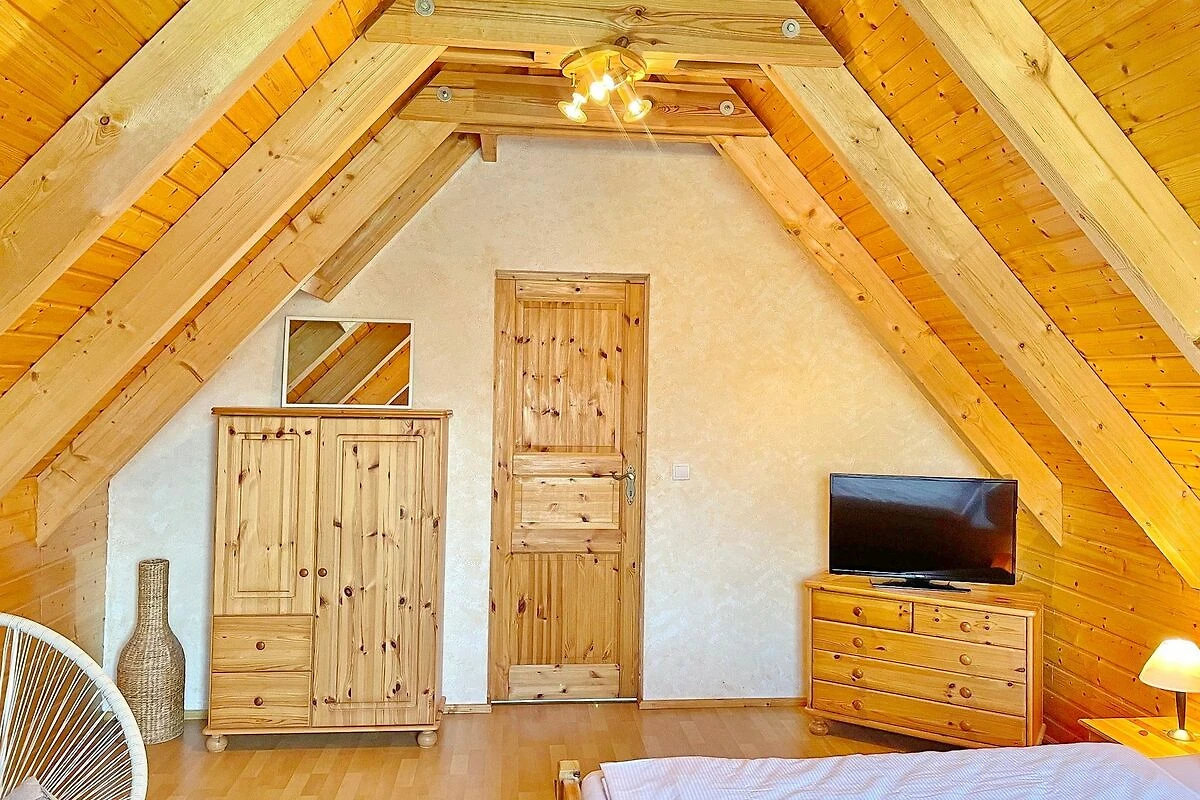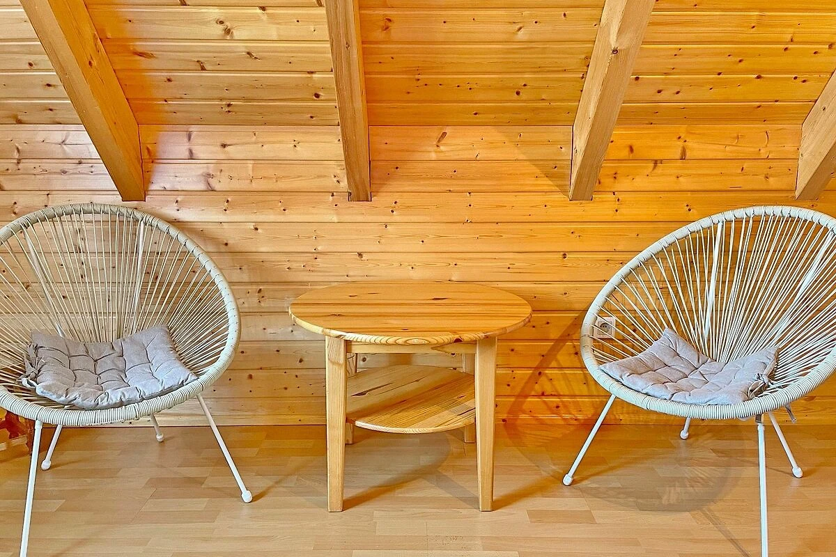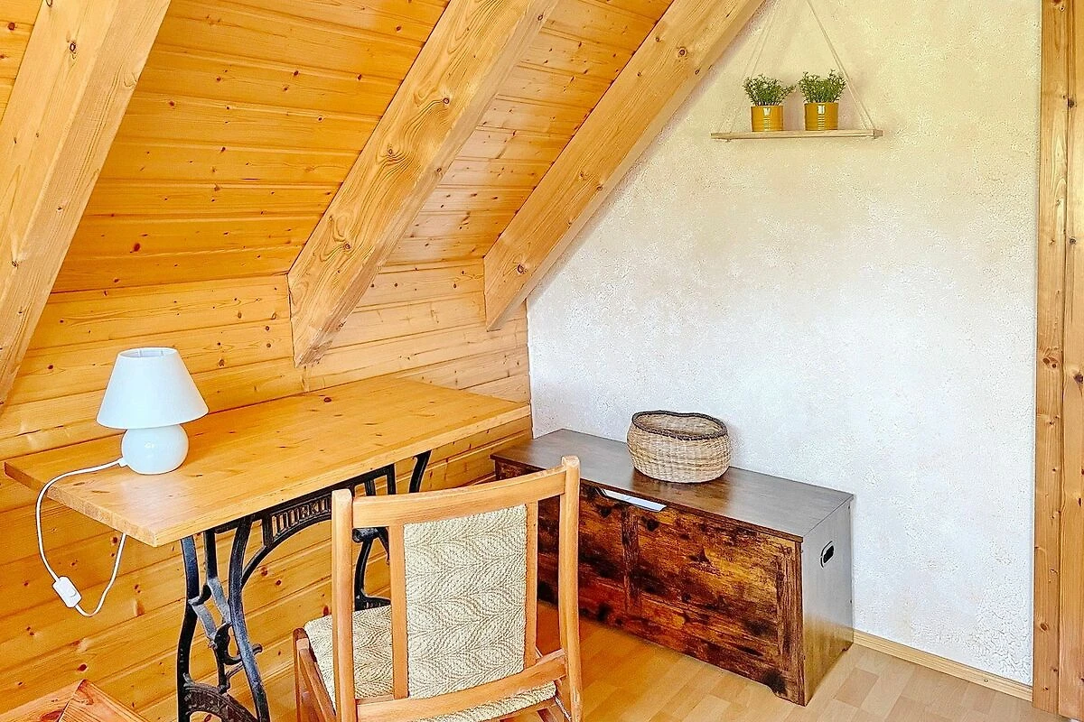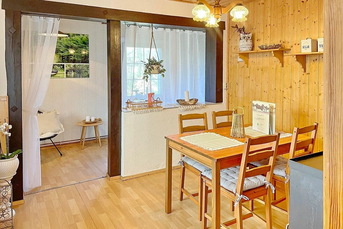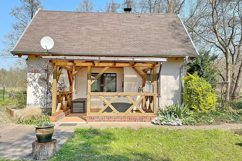 Das spreewaldtypische Haus hat eine überdachte Terrasse am Eingangsbereich, mit einem grossen Esstisch und Bestuhlung. Der Flur ist kombiniert mit einer Küchenzeile (2 Platten-Herd, Abwaschbecken, Toaster, Kaffeemaschine, Wasserkocher und zahlreiche Küchenutensilien) und Zugang zum Esszimmer, mit Tisch und Sitzecke. Das Bad, mit Dusche und WC, sowie das offene Kinderzimmer befinden sich im Erdgeschoss. Das Schlafzimmer mit einem Doppelbett sowie einem Flachbild TV steht Ihnen im Obergeschoss zur Verfügung.