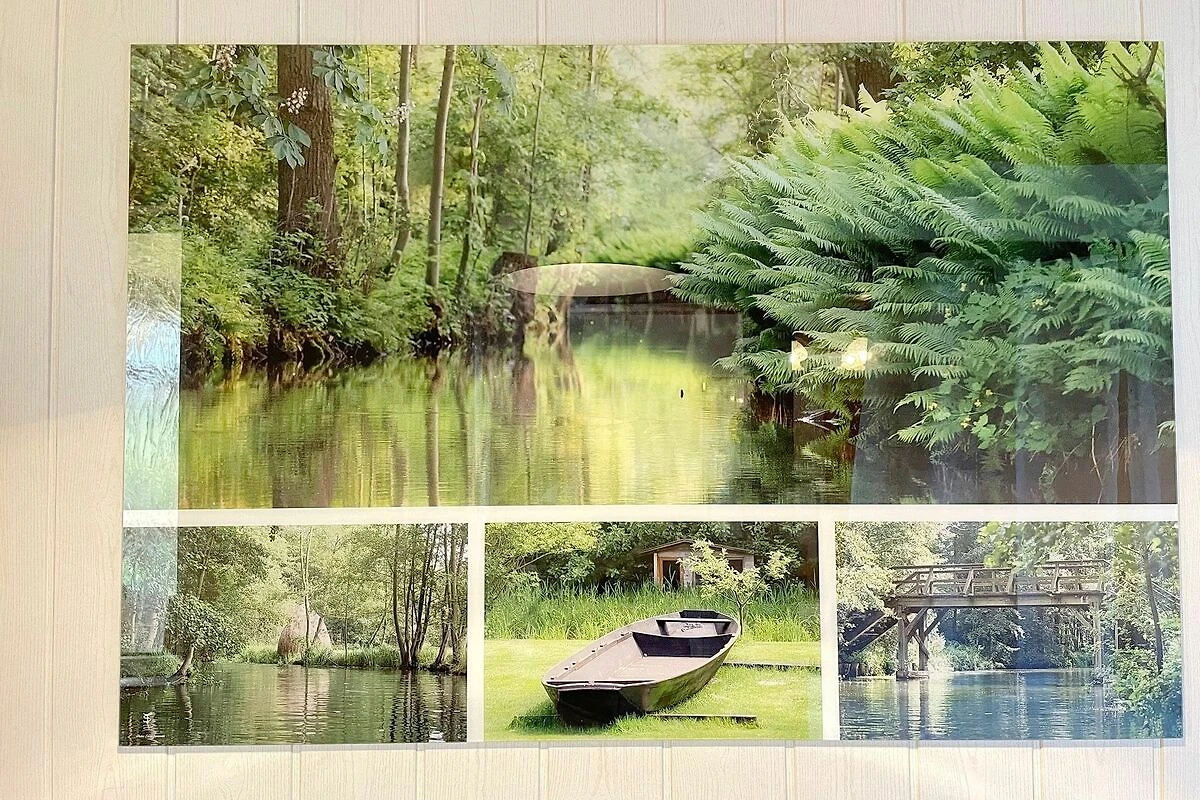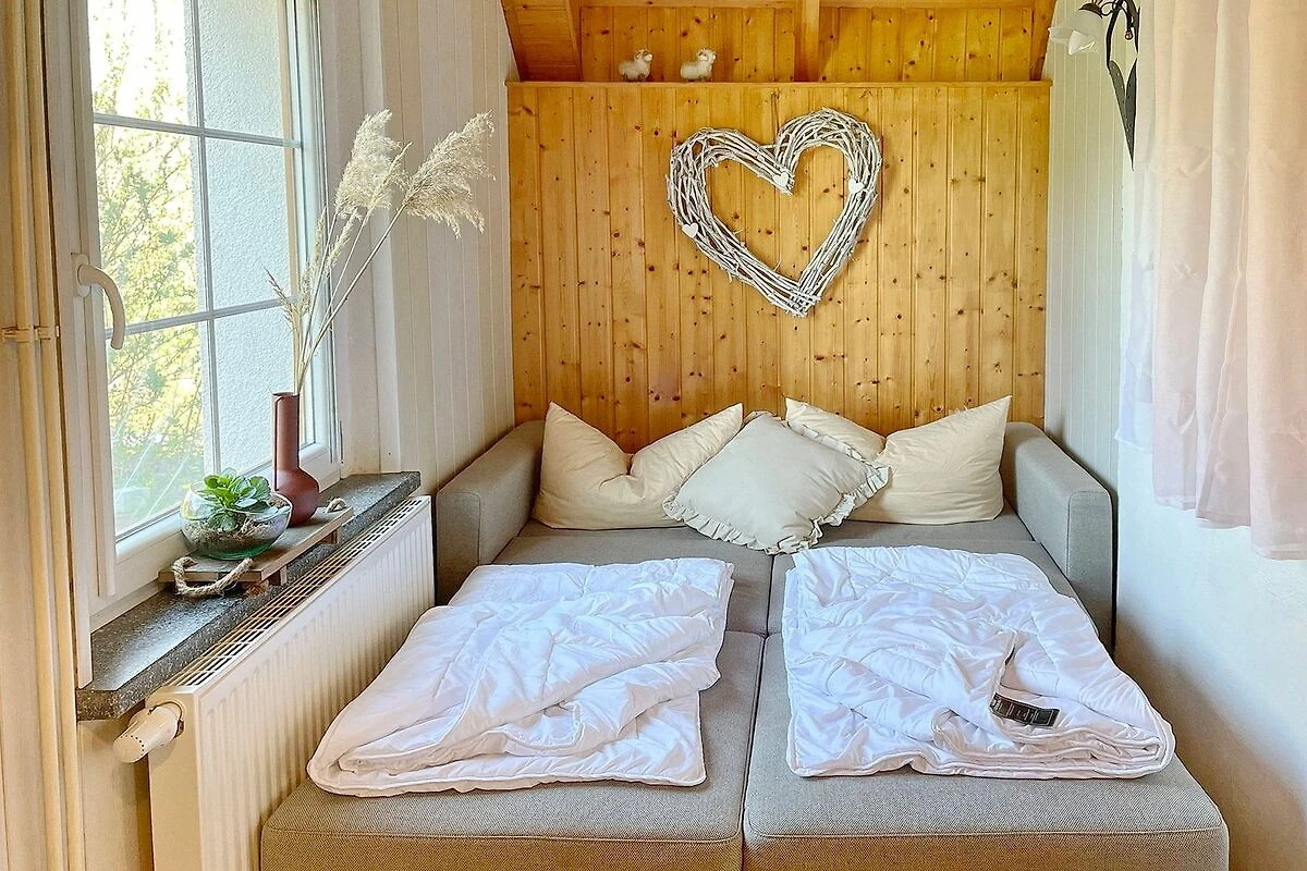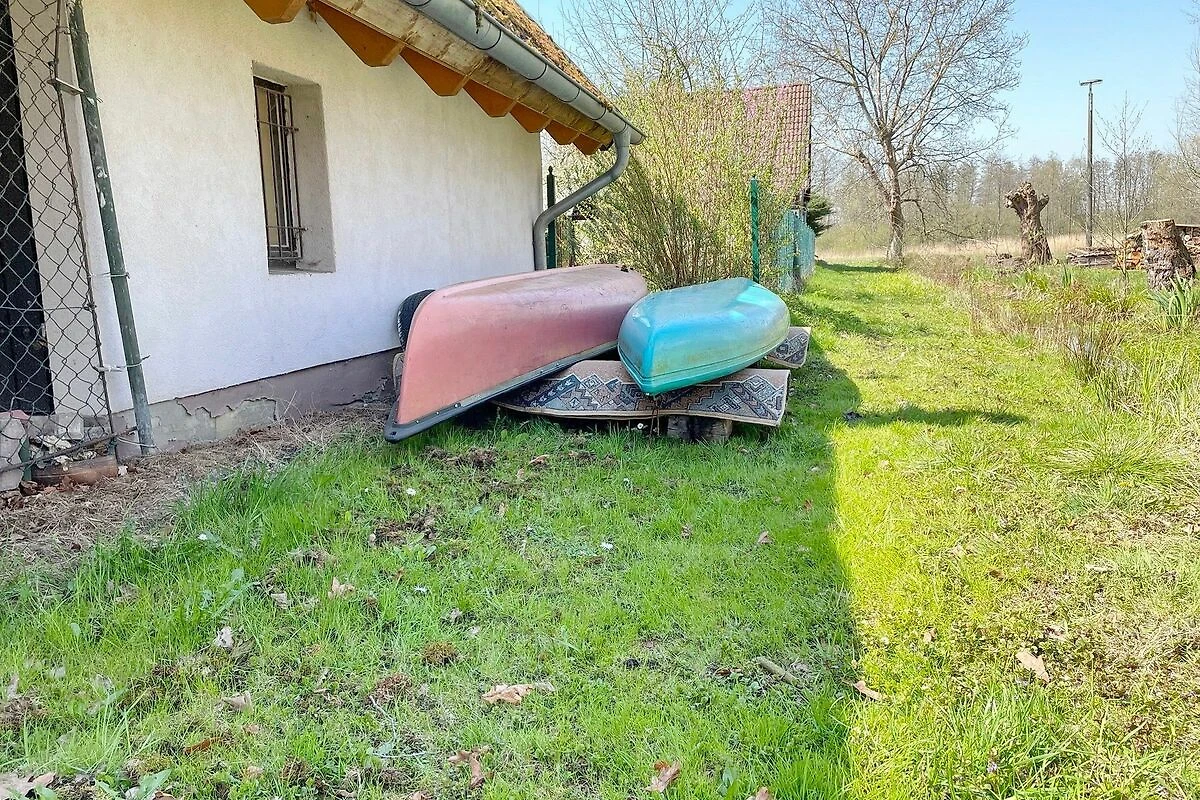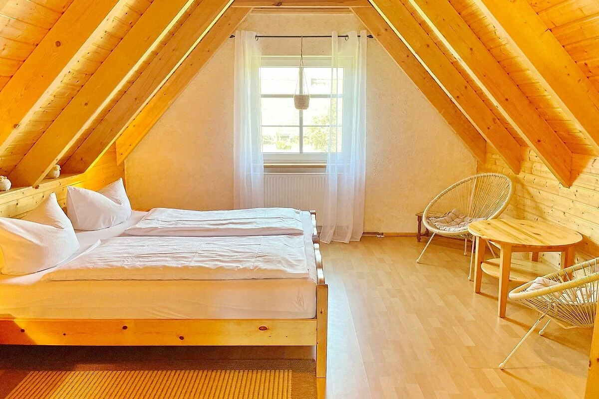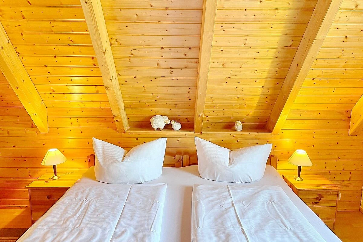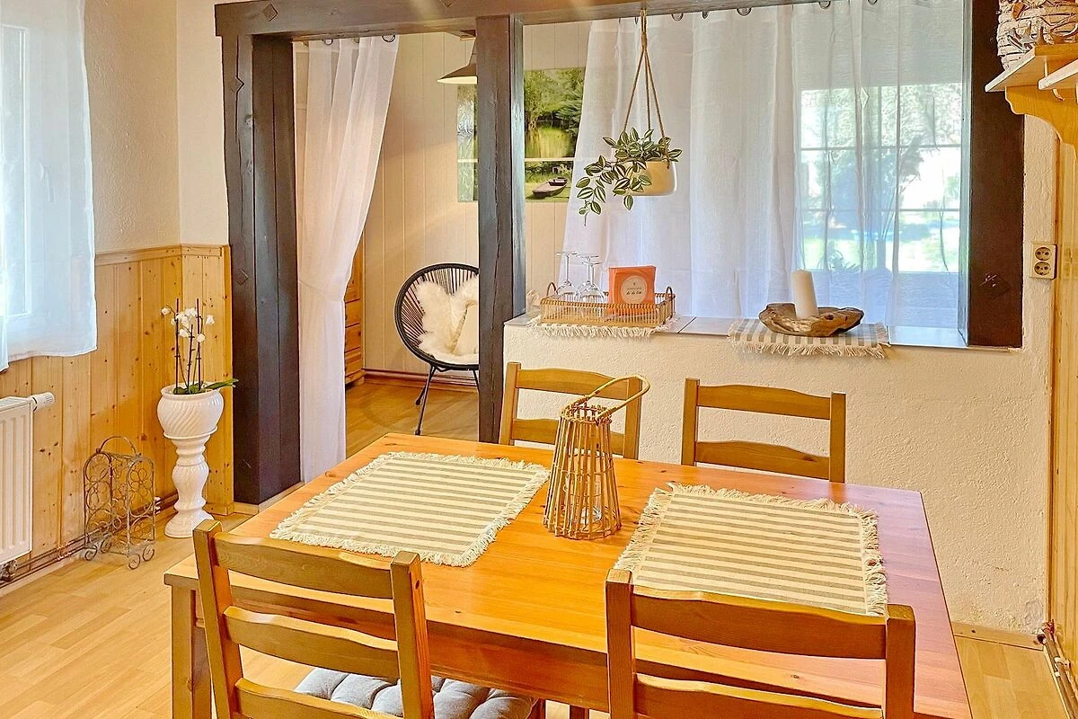 Das spreewaldtypische Haus hat eine überdachte Terrasse am Eingangsbereich, mit einem grossen Esstisch und Bestuhlung. Der Flur ist kombiniert mit einer Küchenzeile (2 Platten-Herd, Abwaschbecken, Toaster, Kaffeemaschine, Wasserkocher und zahlreiche Küchenutensilien) und Zugang zum Esszimmer, mit Tisch und Sitzecke. Das Bad, mit Dusche und WC, sowie das offene Kinderzimmer befinden sich im Erdgeschoss. Das Schlafzimmer mit einem Doppelbett sowie einem Flachbild TV steht Ihnen im Obergeschoss zur Verfügung.