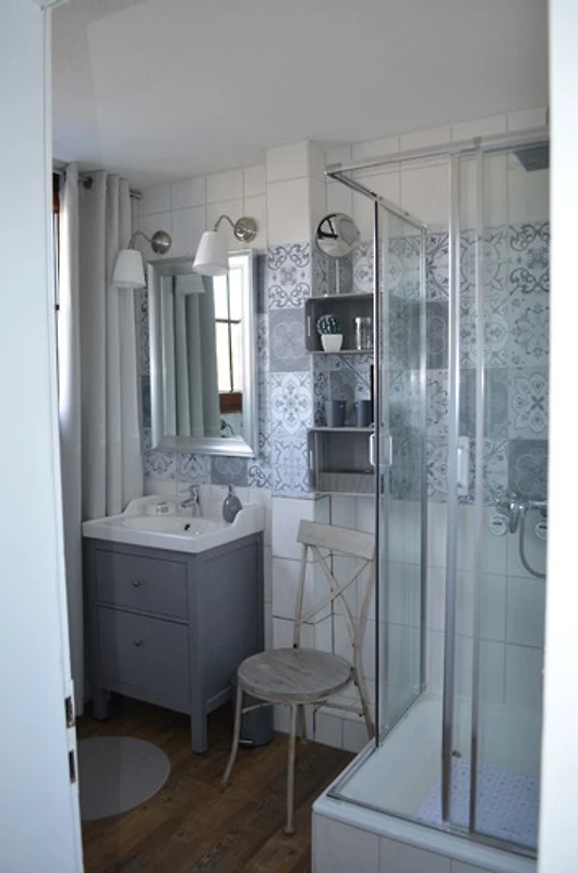 - a bathroom with shower, washbasin and a view of Lake Titisee