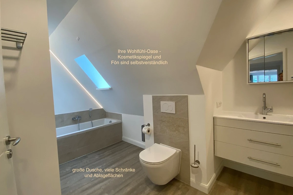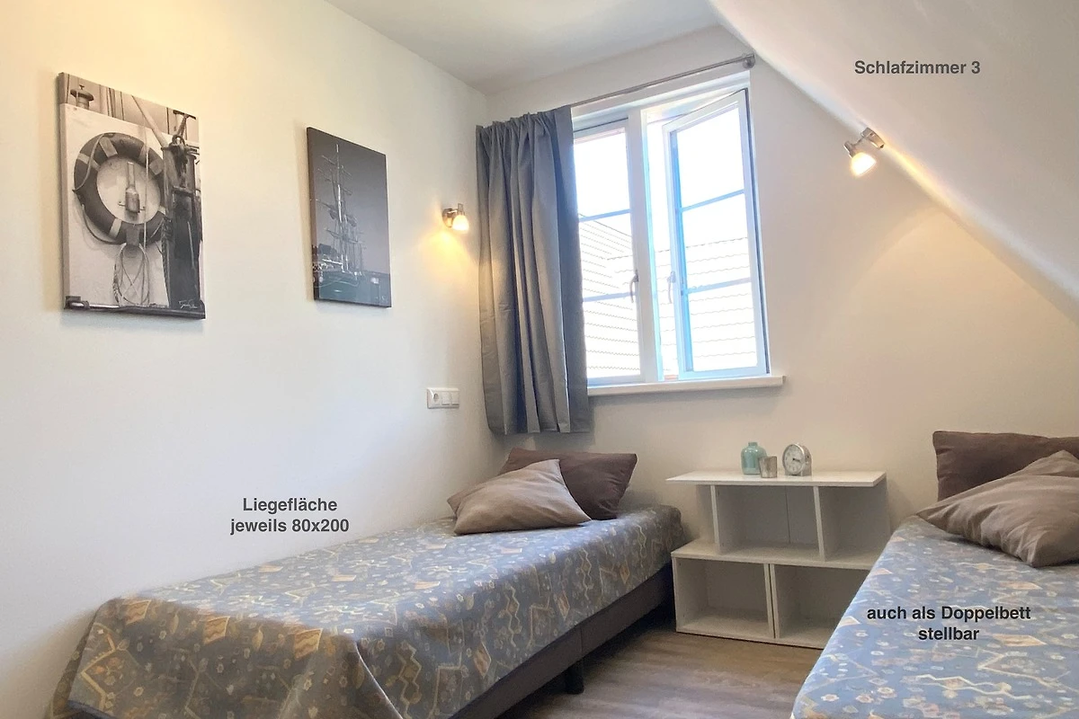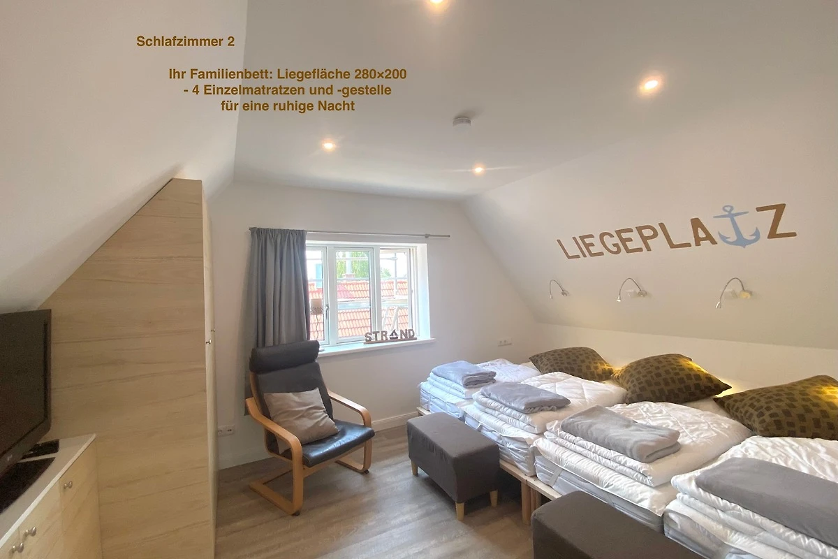 Ankommen und Wohlfühlen - die ca. 140qm grosse, sonnige 4-Zimmer-Nichtraucherwohnung im 1. OG besticht nicht nur durch die tolle Raumaufteilung sondern auch mit dem Familienbett im grössten der 3 Schlafräume - mit 2,80 m Breite hat es für entspannten Schlaf alles einzelne Lattenroste und Matratzen. Diese Komfort-Wohnung bietet - nicht zuletzt durch die 2 Bäder - die perfekte Grundlage für Ihren "Wohlfühl-Urlaub mit skandinavischem Flair" mit bis zu 8 Personen. Neben dem Doppelzimmer mit Leseecke und kleinem Arbeitsplatz gibt es noch ein 2-Bettzimmer; die hier befindlichen Einzelbetten lassen sich auch prima als Doppelbett zusammenschieben.