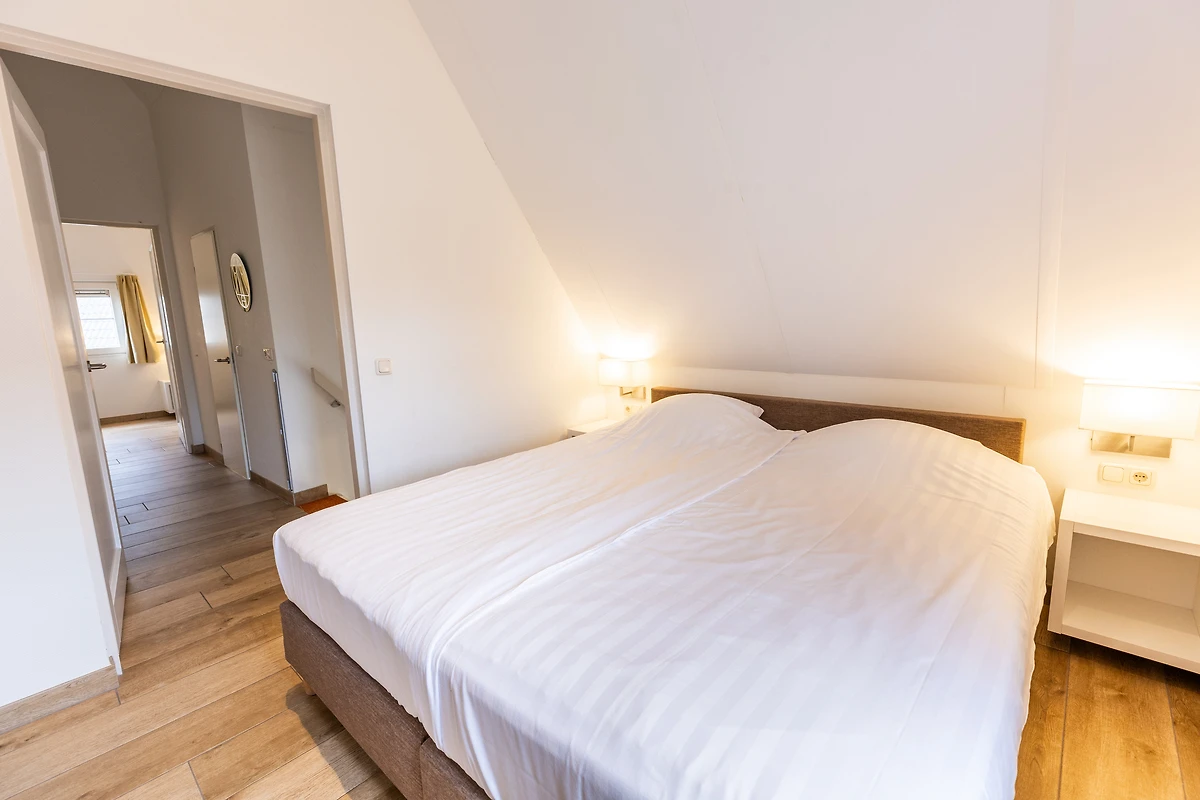 Im ersten Obergeschoss befinden sich die weiteren komfortablen Schlafzimmer mit luxuriösen Boxspringbetten. Die ruhige Ausstrahlung und der angenehme Lichteinfall tragen zu einem erholsamen Schlaf bei. Das Badezimmer ist modern gestaltet und mit Dusche, Waschbecken, WC und Whirlpool ausgestattet – ideal, um den Tag entspannt zu beginnen oder ausklingen zu lassen.