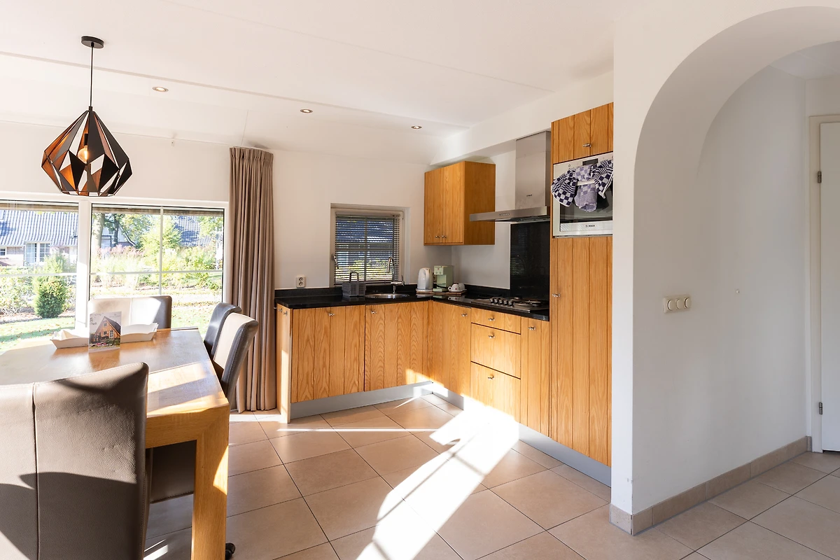 Das helle und einladende Wohnzimmer lädt zu entspannten Momenten zusammen ein und verfügt über eine komfortable Sitzecke und einen Kamin. Grosse Fenster holen die Natur ins Haus und sorgen für ein offenes, grosszügiges Raumgefühl. Die moderne offene Küche ist mit allen Annehmlichkeiten ausgestattet, darunter ein 5-Flammen-Herd mit Wokbrenner. Durch die Flügeltüren gelangen Sie direkt auf die Terrasse, wo Gartenmöbel für lange Abende im Freien bereitstehen. Im Abstellraum steht Ihnen eine Waschmaschine zur Verfügung, was während Ihres Urlaubs zusätzlichen Komfort bietet.