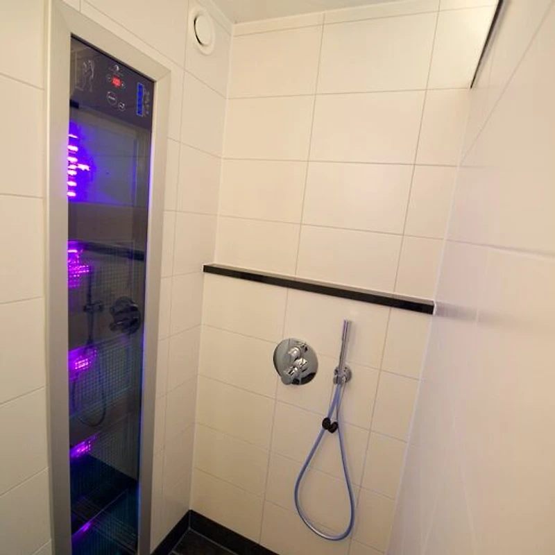 Im Obergeschoss befinden sich zwei komfortable Schlafzimmer mit luxuriösen Boxspringbetten, in denen Sie wunderbar entspannen können. Besonders hervorzuheben ist der umfangreiche Wellnessbereich: Entspannen Sie in Ihrer eigenen Sauna und geniessen Sie die Sunshower, Regendusche und den Whirlpool. Das Haus ist kinderfreundlich eingerichtet und verfügt über praktische Extras wie eine Waschmaschine.