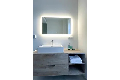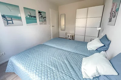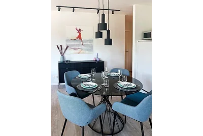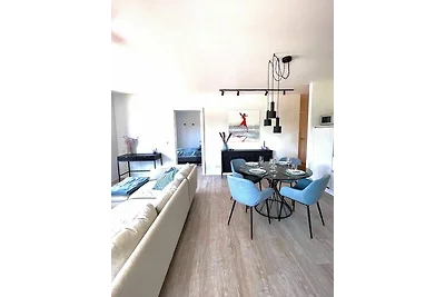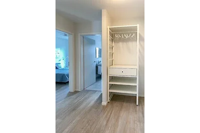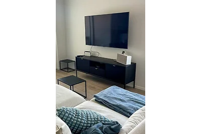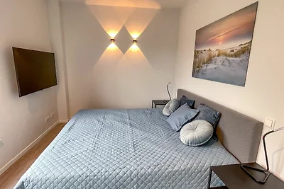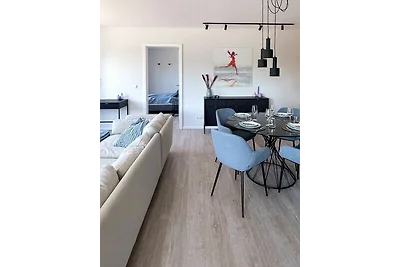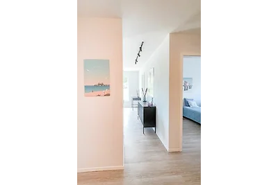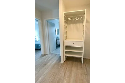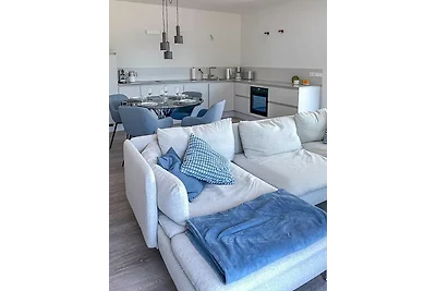 Bereits beim Betreten der Wohnung ist der Wohlfühl-Charakter ausgelöst. Der Eingangsbereich ist mit einer Garderobe ausgestattet. Das erste Schlafzimmer ist mit einem Doppelbett eingerichtet, dass bei Bedarf auch getrennt werden kann. Außenrollläden verdunkeln das Zimmer für einen ruhigen Schlaf. Das zweite Schlafzimmer ist mit einen Bett mit der Größe 180x200 , einem TV-Gerät sowie einem Kleiderschrank eingerichtet. Außenrollläden sorgen auch hier für einen erholsamen Schlaf. Das in heller Optik gehaltene Duschbad hat eine bodentiefe Dusche, Fön und einen Handtuchheizkörper. Der Wohn-Essbereich ist großzügig eingerichtet und durch die bodentiefen Fenster mit Süd- und Westausrichtung hell und freundlich. Ein großer Tisch mit bequemen Schalenstühlen bietet ausreichend Platz. Die offene Küche mit heller Oberfläche ist mit hochwertigen Elektrogeräten ausgestattet: Herd mit integriertem Dunstabzug, Backofen, Mikrowelle, Geschirrspüler, Kühl-/Gefrierkombination, Wasserkocher, Toaster, Filterkaffeemaschine, Nespressomaschine und Milchaufschäumer. Der Wohnbereich ist bequem fein ausgestattet. Ein Smart -Flachbildschirm lässt keine Wünsche offen. Via Bluetooth verbinden und eigene Musik hören - Kein Problem. Auch an einem verregneten Tag lädt eine Nintendo-Switch inkl. einiger Spiele ein, die Zeit gemütlich auf dem Sofa zu verbringen . Vom Wohnzimmer kommen Sie auf die Terrasse in Süd- und West Lage . Die Sonne begrüßt seine Gäste zum Mittag und Abend. Ein großer Tisch mit vier Stühlen und ein bequemes Loungesofa lädt zu gemütlichen Stunden ein. Außerdem verfügt die Wohnung über ein Gäste-WC. Eine Waschmaschine befindet sich in einem Abstellraum in der Wohnung.