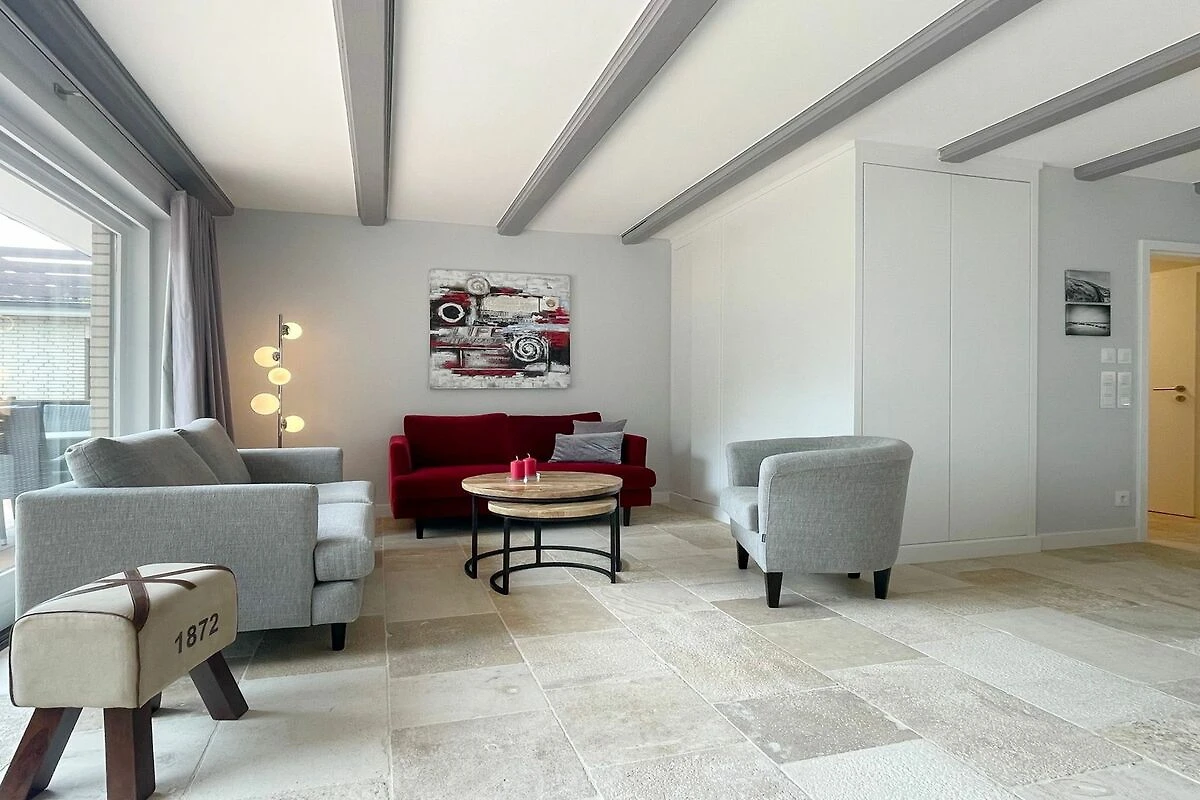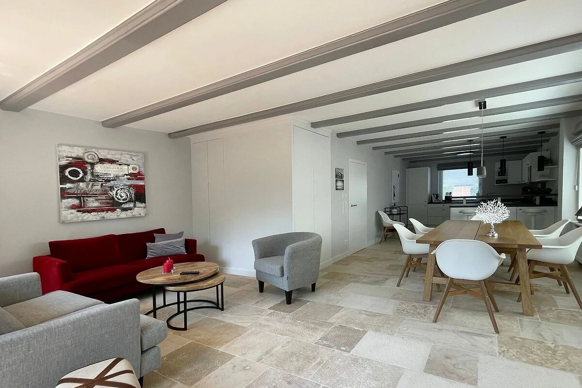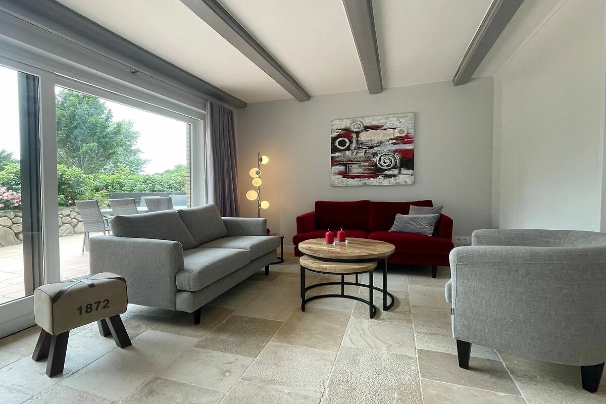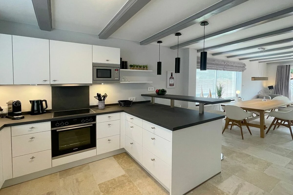 Wohnzimmer mit Natursteinböden, edle Tischlereinbauten, Smart-TV, Couchgruppe und Esstisch für 6 Personen. Die offene Küche ist umfangreich ausgestattet und lässte praktisch keine Wünsche offen.