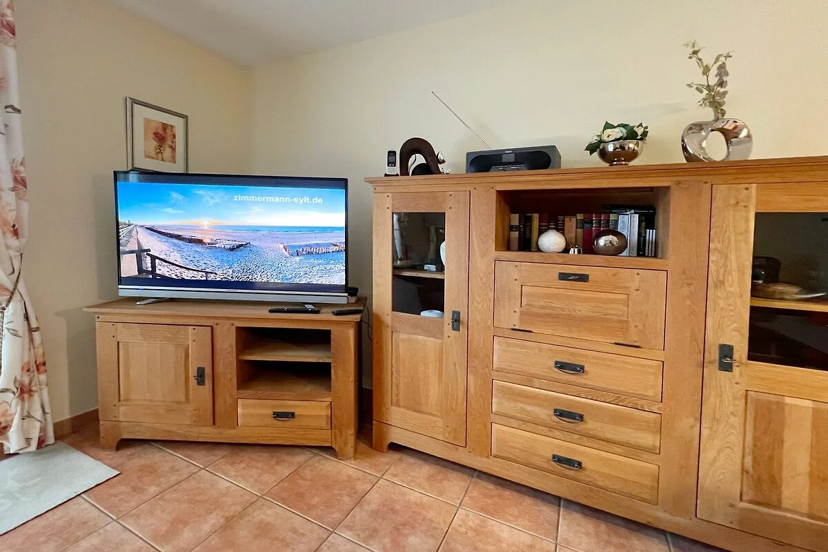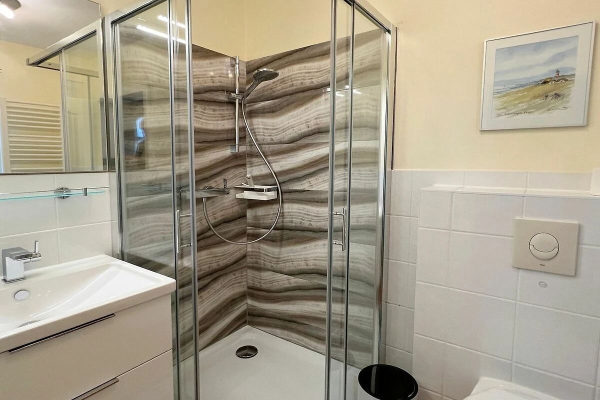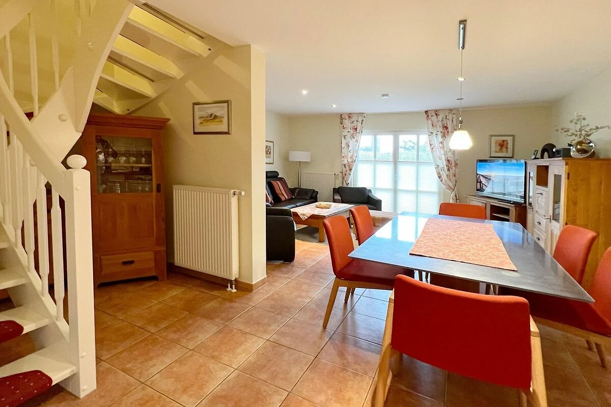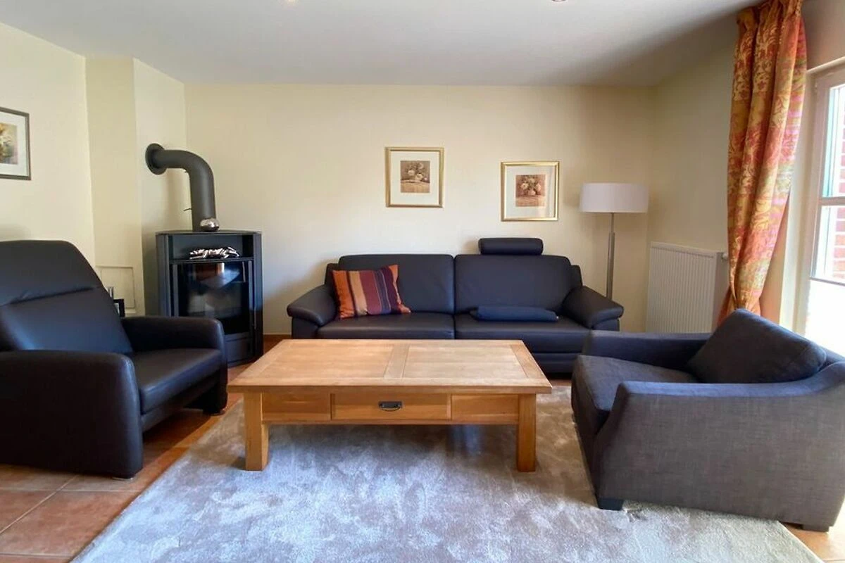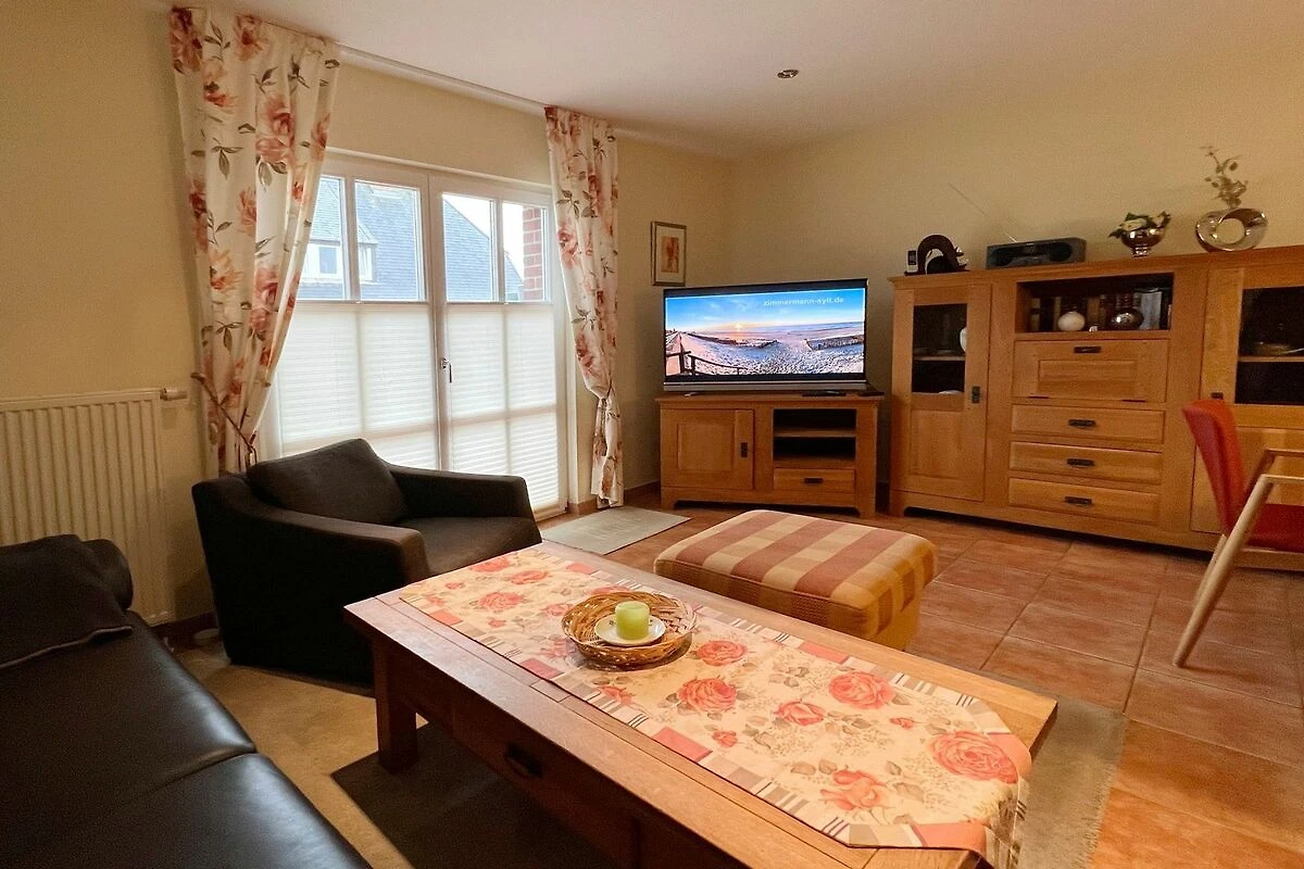 Ferienhaus (EG/OG/SB) mit Terrasse in zentraler und strandnaher Lage Westerlands, Wohnzimmer mit Sitzgruppe und Essecke, Kaminofen, Fernseher (Smart-TV ), offene Küche mit Geschirrspüler, Backofen und Mikrowelle, 2 Duschbäder, 3 Schlafzimmer für je 2 Personen, Waschmaschine und Trockner, 1 PWK-Stellplatz.