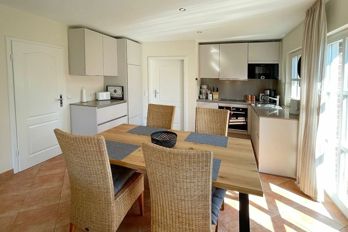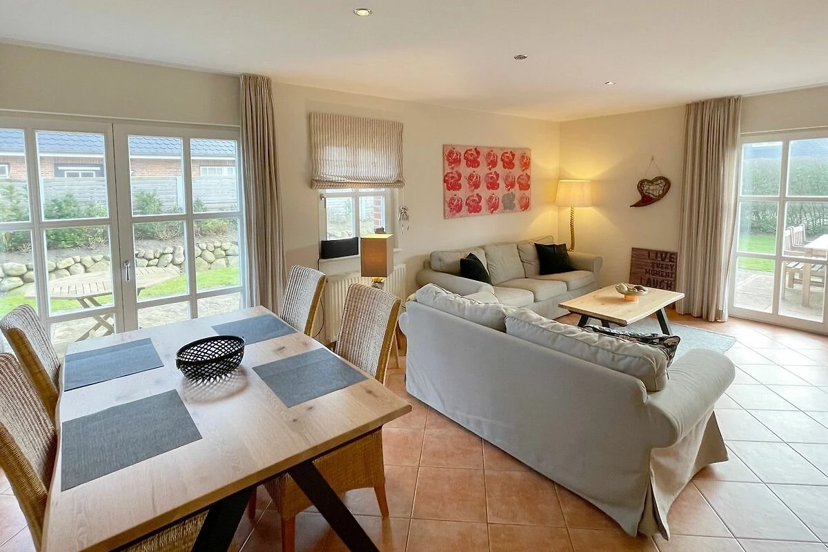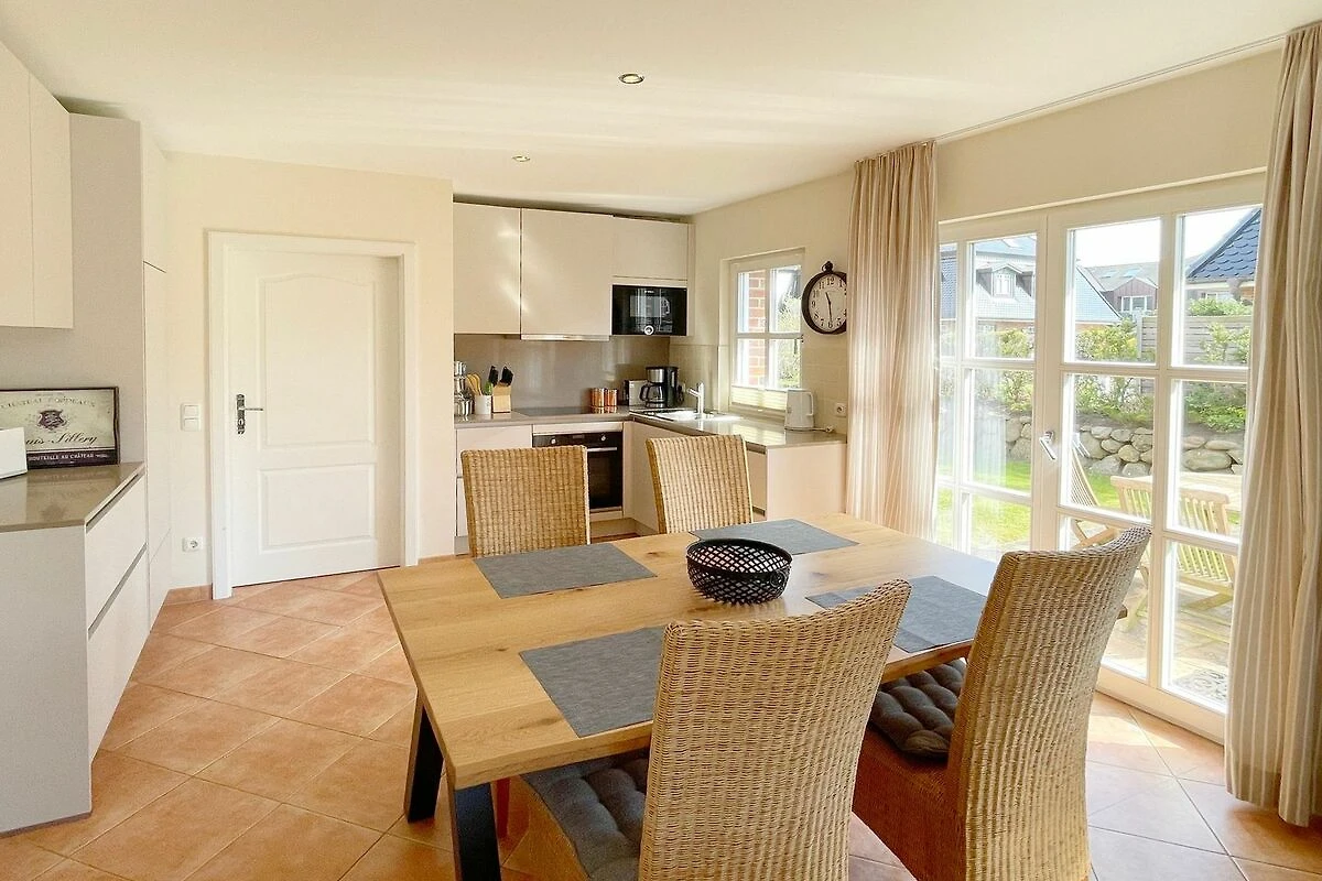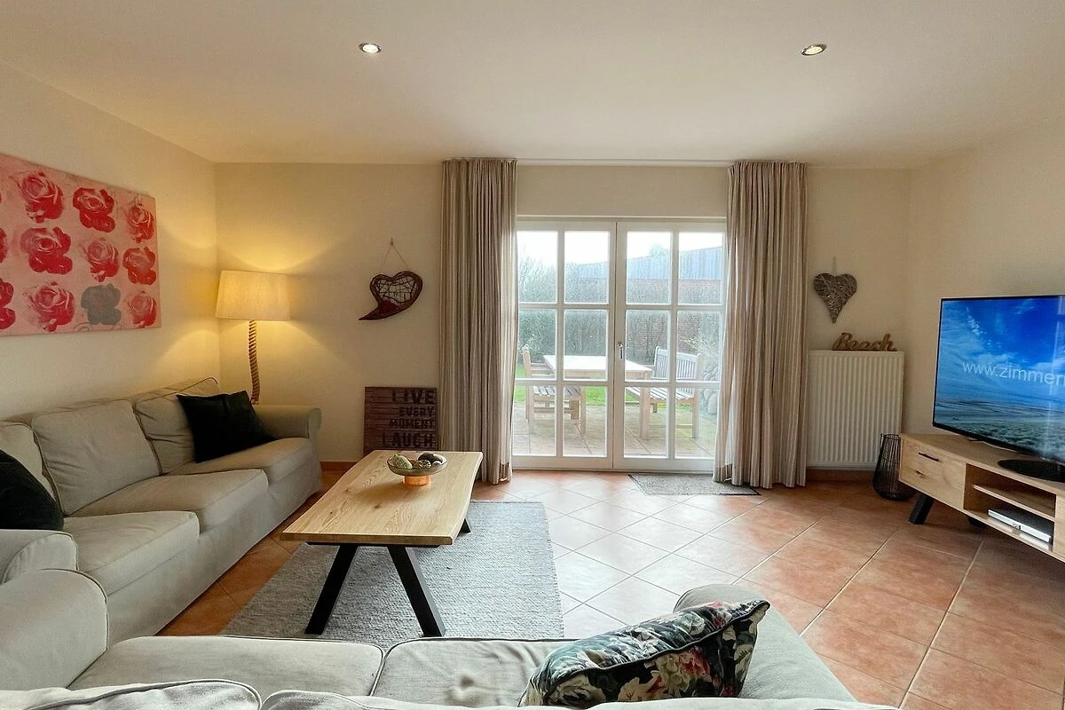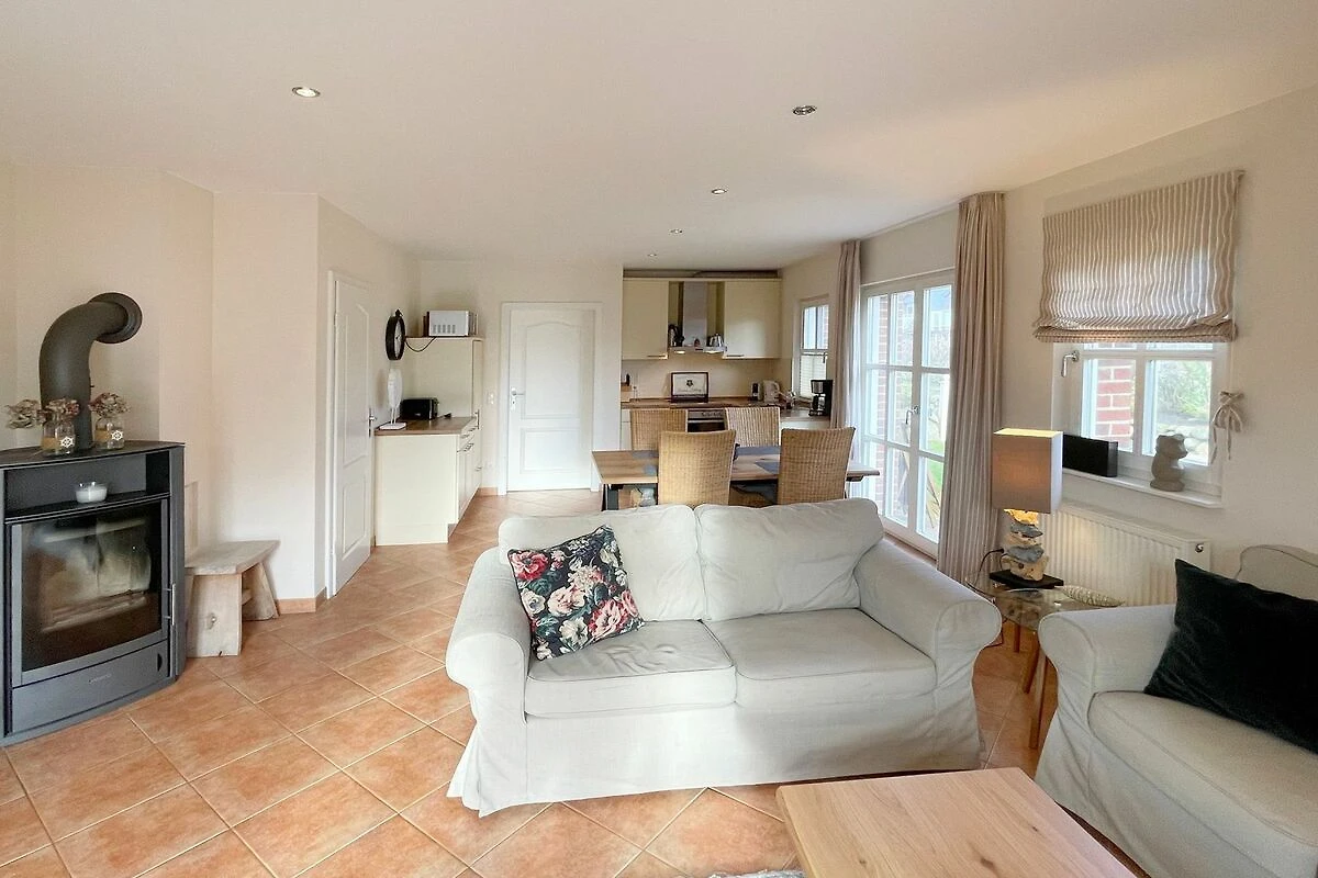 Reihenendhausteil mit 2 Terrassen in zentraler, strandnaher Lage, Wohnzimmer mit Sitzgruppe und Essecke, Kaminofen, Fernseher (Smart-TV[nbsp] offene Küche mit Geschirrspüler und Backofen, 2 Bäder mit Waschbecken und WC, 2 Schlafzimmer mit Doppelbett für je 2 Personen, Waschmaschine und Trockner