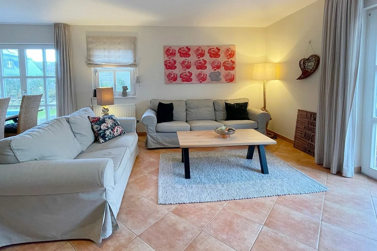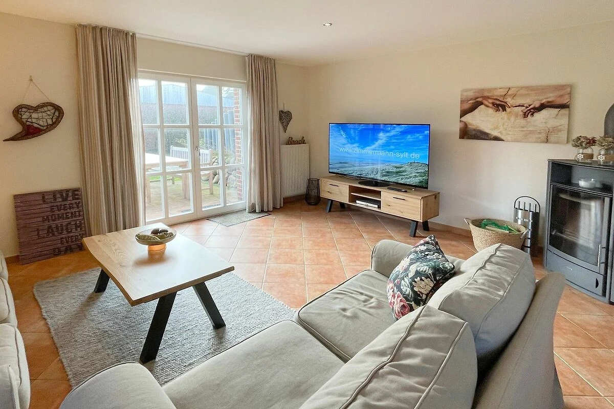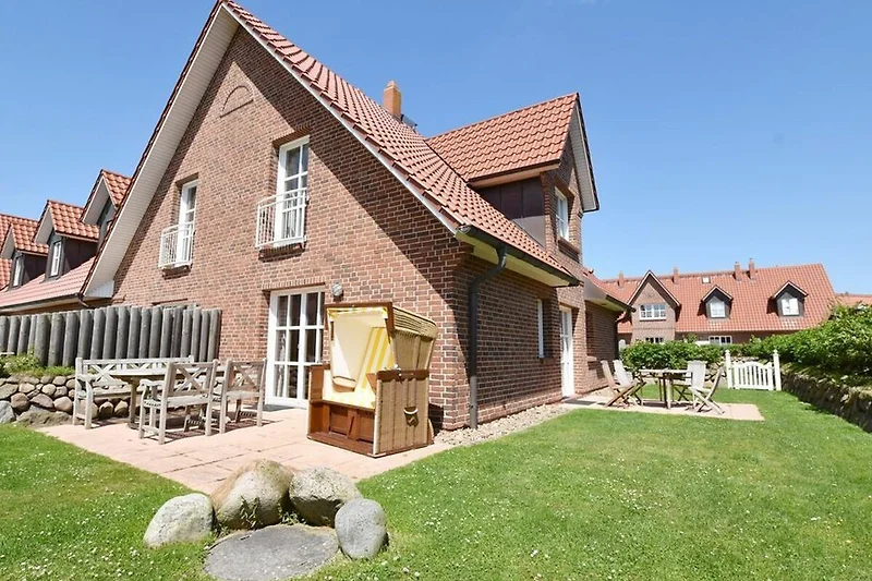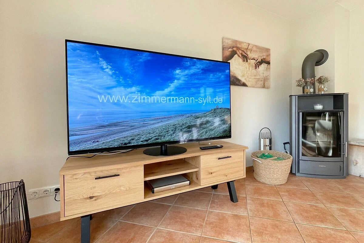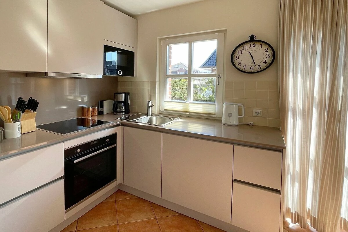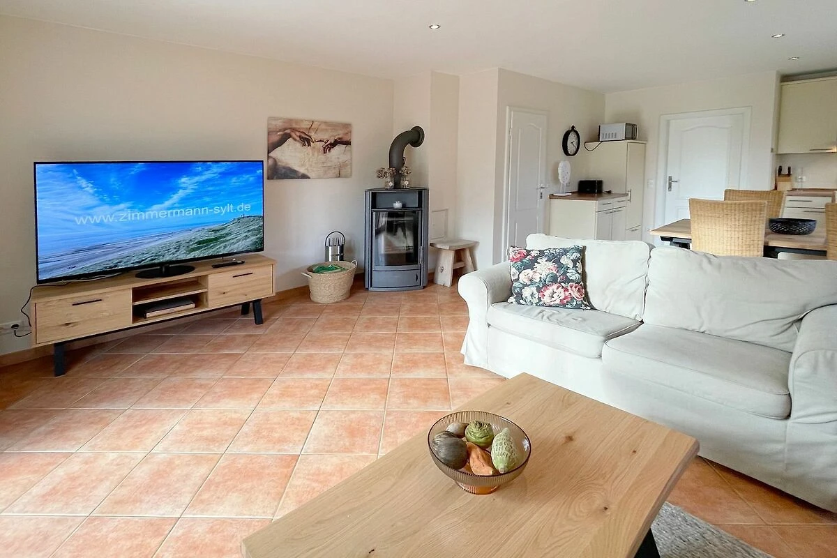 Reihenendhausteil mit 2 Terrassen in zentraler, strandnaher Lage, Wohnzimmer mit Sitzgruppe und Essecke, Kaminofen, Fernseher (Smart-TV[nbsp] offene Küche mit Geschirrspüler und Backofen, 2 Bäder mit Waschbecken und WC, 2 Schlafzimmer mit Doppelbett für je 2 Personen, Waschmaschine und Trockner