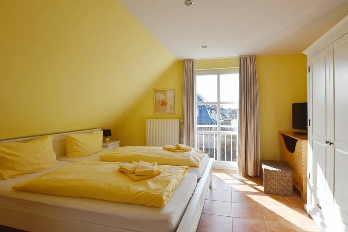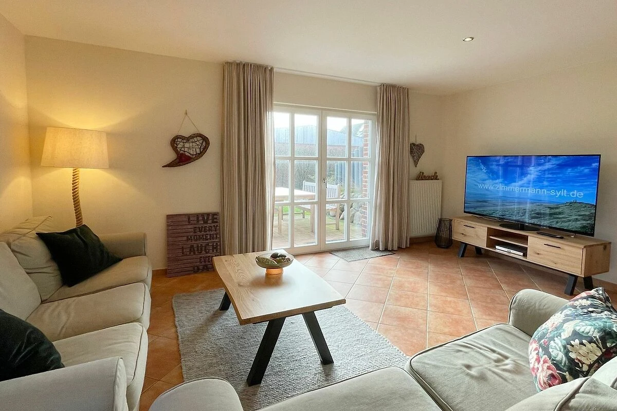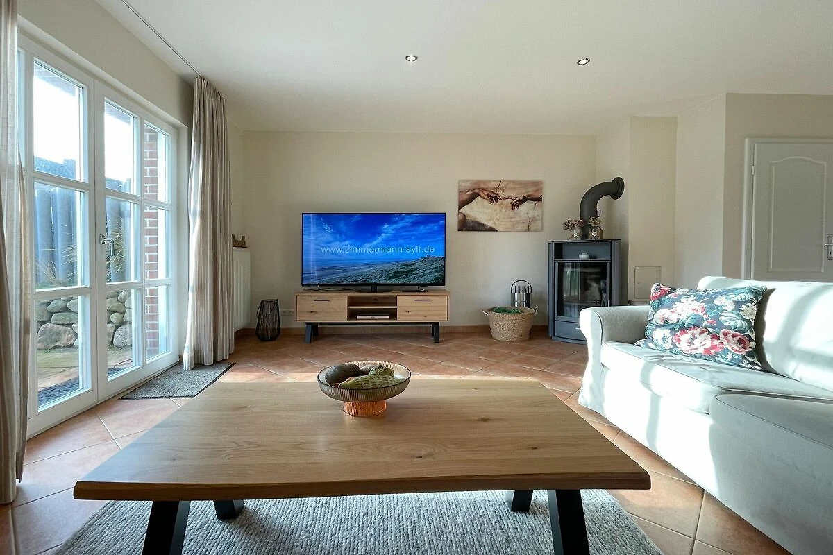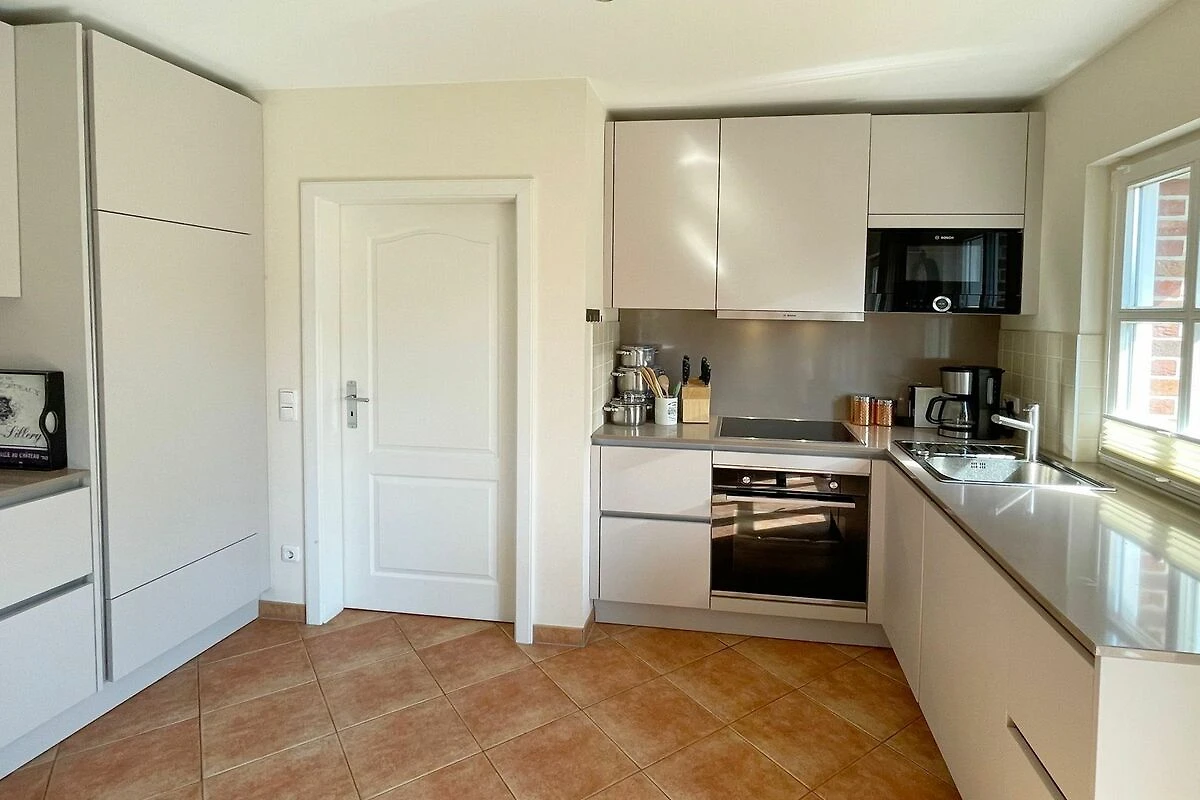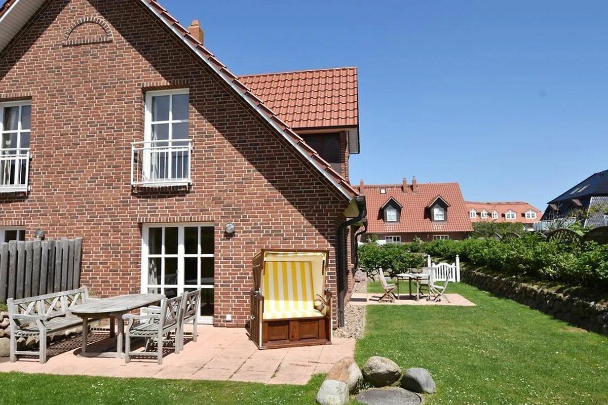 Reihenendhausteil mit 2 Terrassen in zentraler, strandnaher Lage, Wohnzimmer mit Sitzgruppe und Essecke, Kaminofen, Fernseher (Smart-TV[nbsp] offene Küche mit Geschirrspüler und Backofen, 2 Bäder mit Waschbecken und WC, 2 Schlafzimmer mit Doppelbett für je 2 Personen, Waschmaschine und Trockner